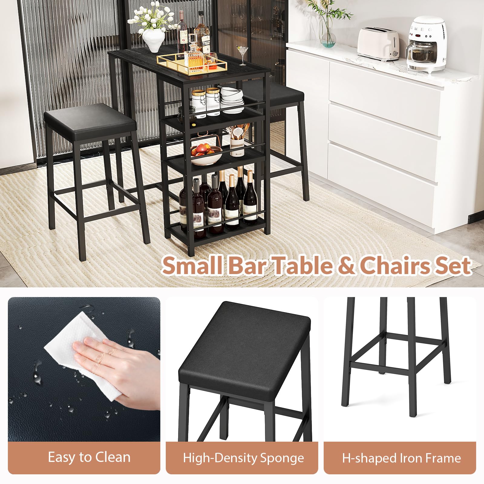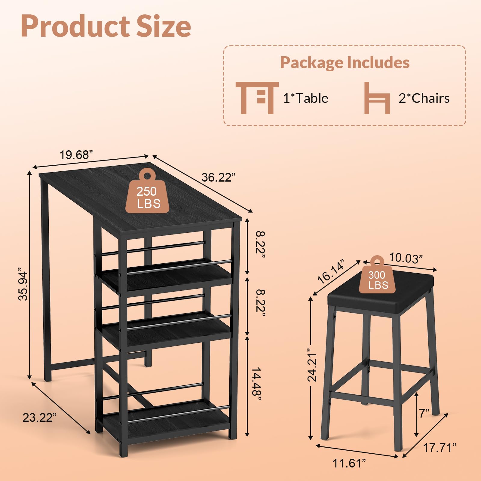 3 Pieces Pub Dining Table Set, Dining Table Set for 2, Counter Height Dining Set, Black Kitchen Bar Table, with 3 Storage Shelf & 2 H-Shaped Frame Support PU Stools for Bar, Kitchen-Black