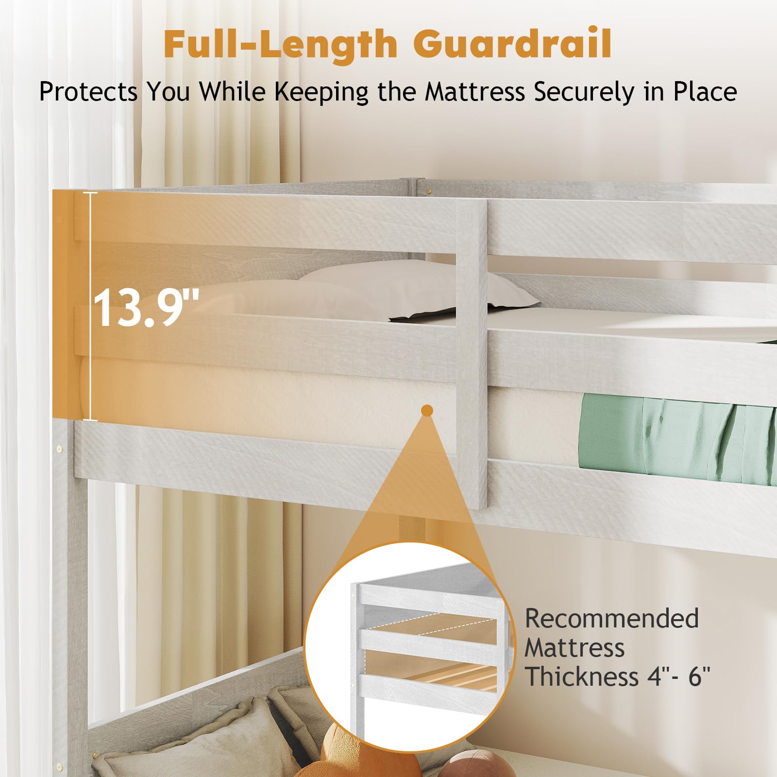 【Mattress Not Included】This bunk bed does not come with a mattress, giving you the flexibility to choose your preferred mattress. It is compatible with a standard twin-size mattress (39" x 75"). A mattress height of 4-6 inches is recommended