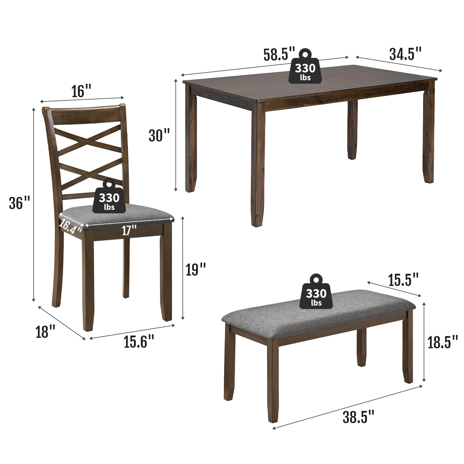 6-Piece Solid Wood Dining Table Set, Includes 1 Dining Table, 4 Upholstered Chairs and 1 Bench, Wooden Legs Dining Table Set for Dining Room, Kitchen, Restaurant, Walnut