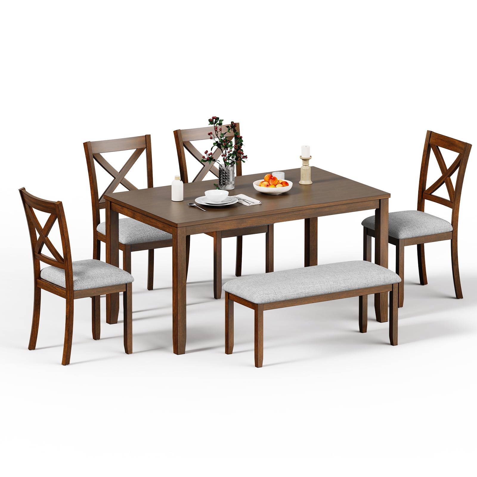 6-Piece Solid Wood Dining Table Set, Including 1 Dining Table, 4 Upholstered Chairs and 1 Bench, Wooden Dining Table Set for Kitchen, Dining Room, Walnut