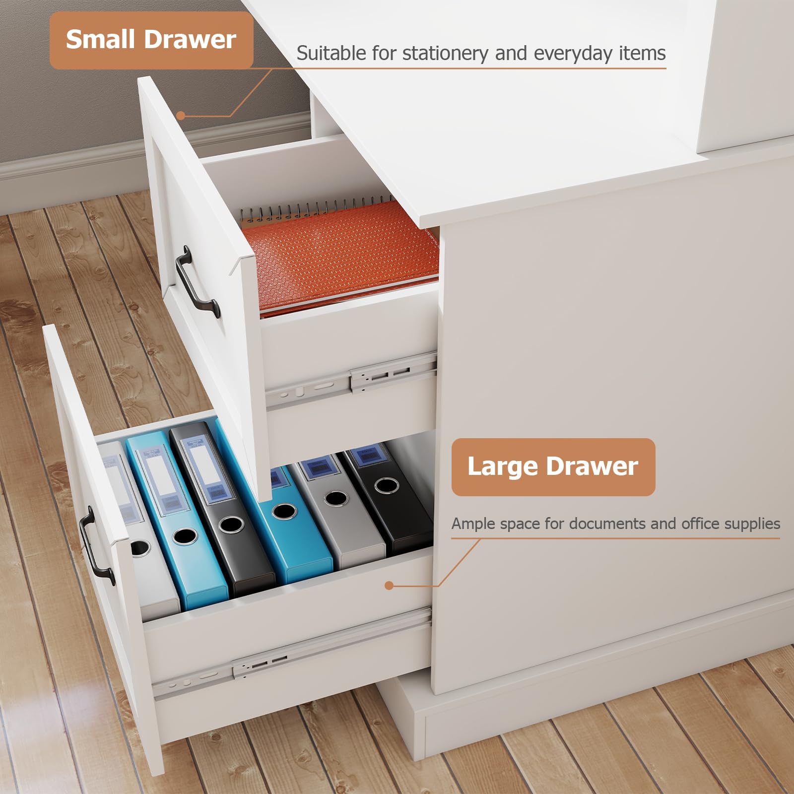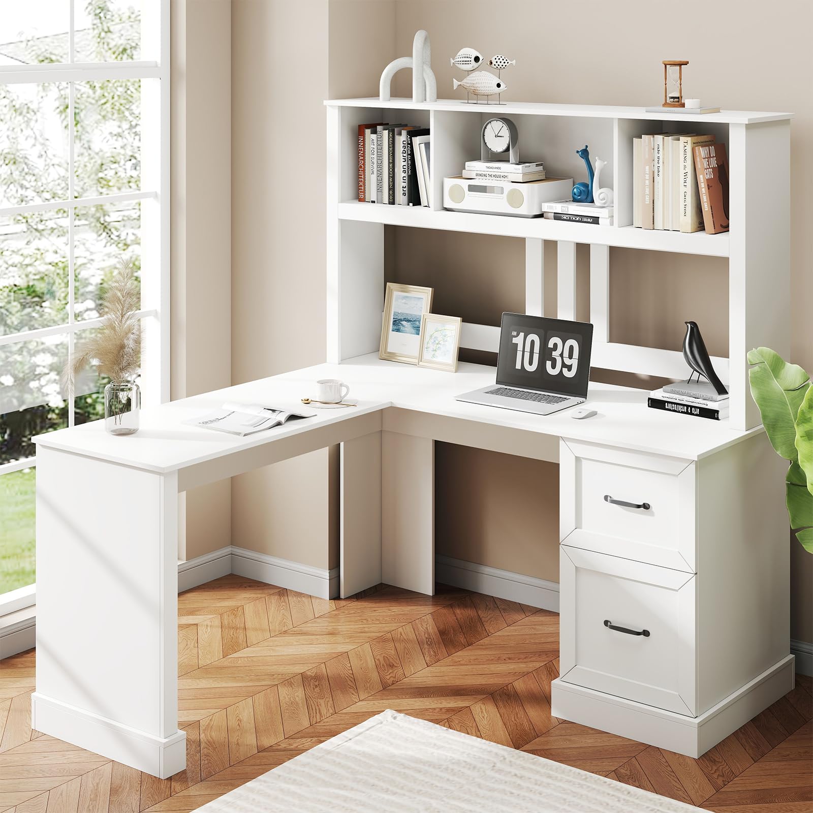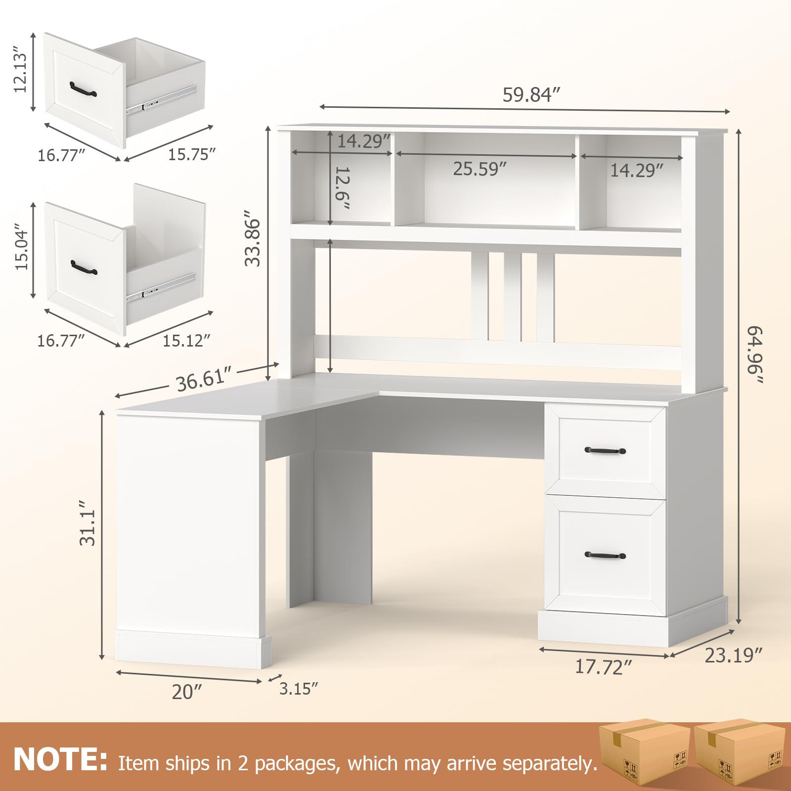 60" L Shaped Desk with Hutch and Drawers, Corner Computer Desk with Open Storage Shelves, Wooden Executive Desk for Home Office or Bedroom, Modern White
