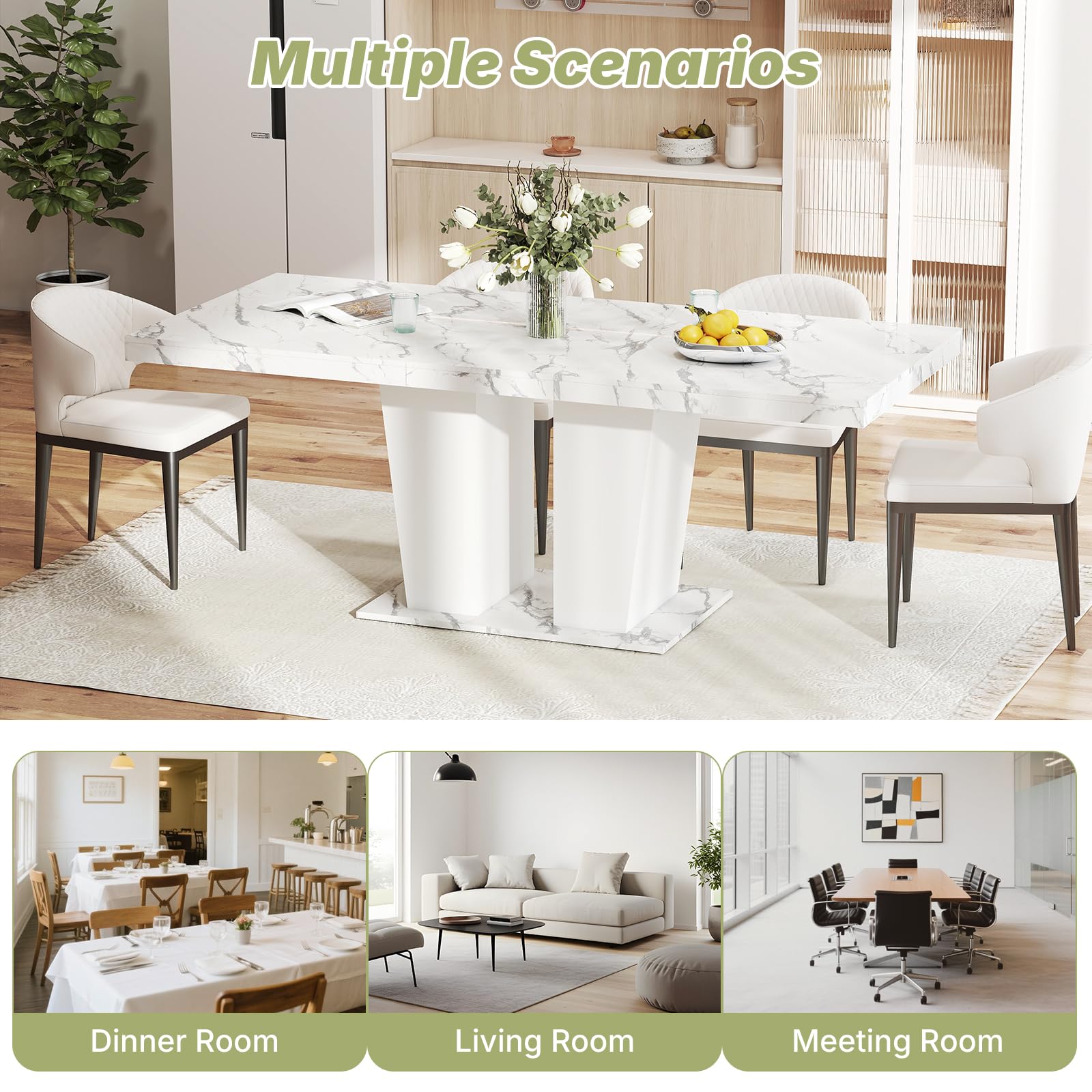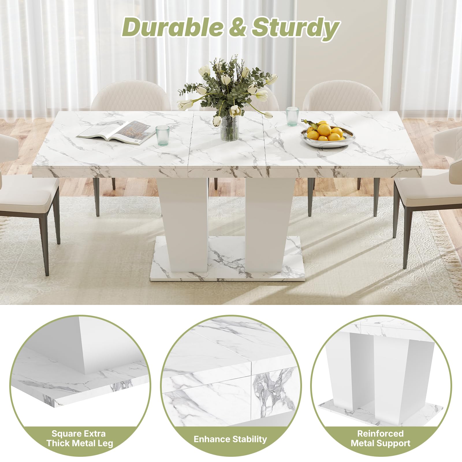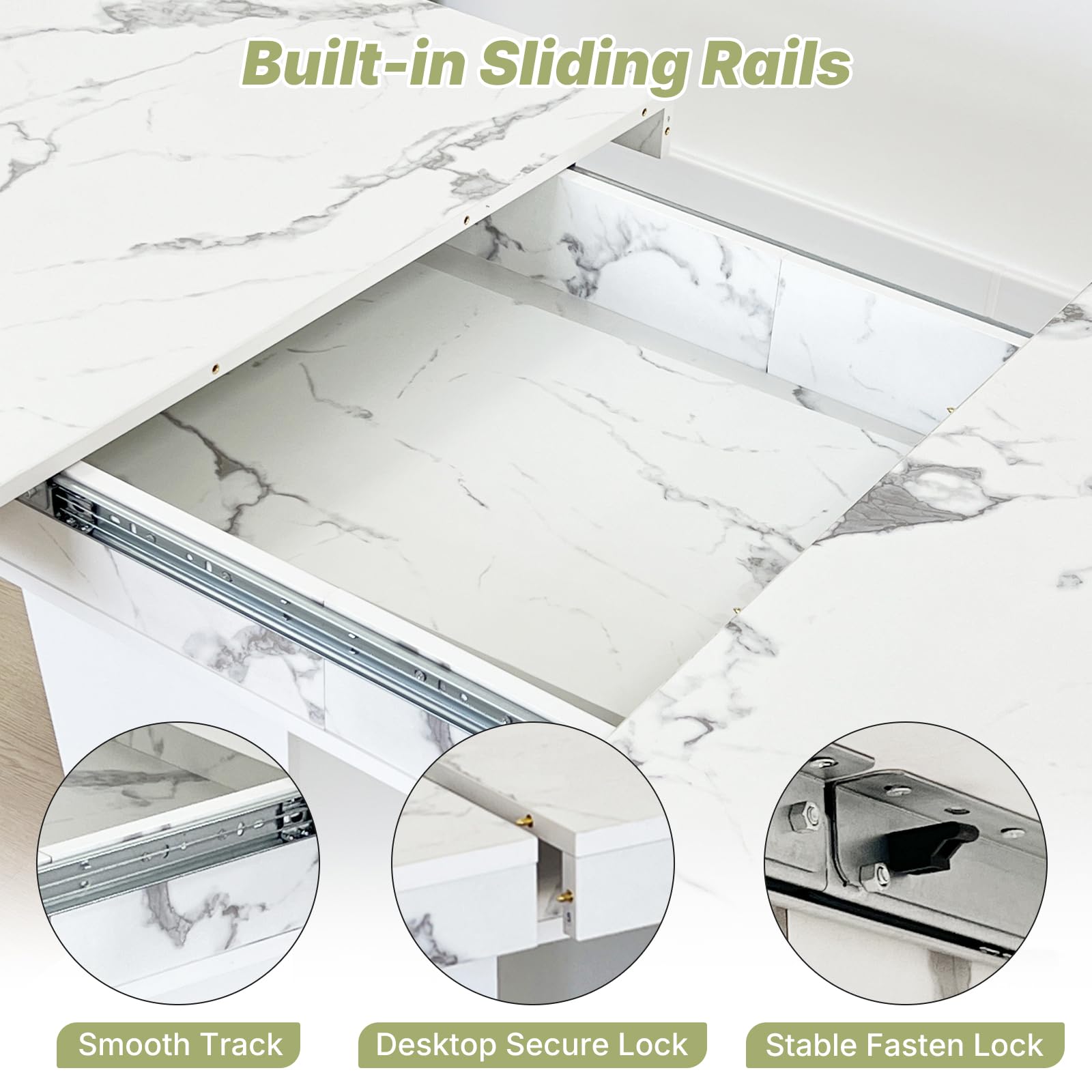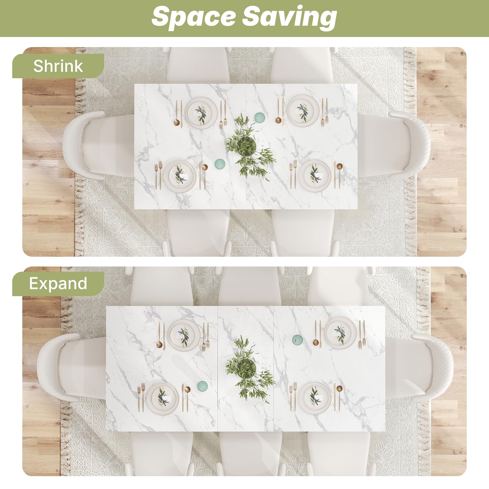 63"-78.7" Expandable Dining Table, 6-10 Farmhouse Kitchen Table, Extendable Console Table, Wooden Farmhouse Kitchen Table with Metal Track & Dual Column Base for Dining Room, Office-White