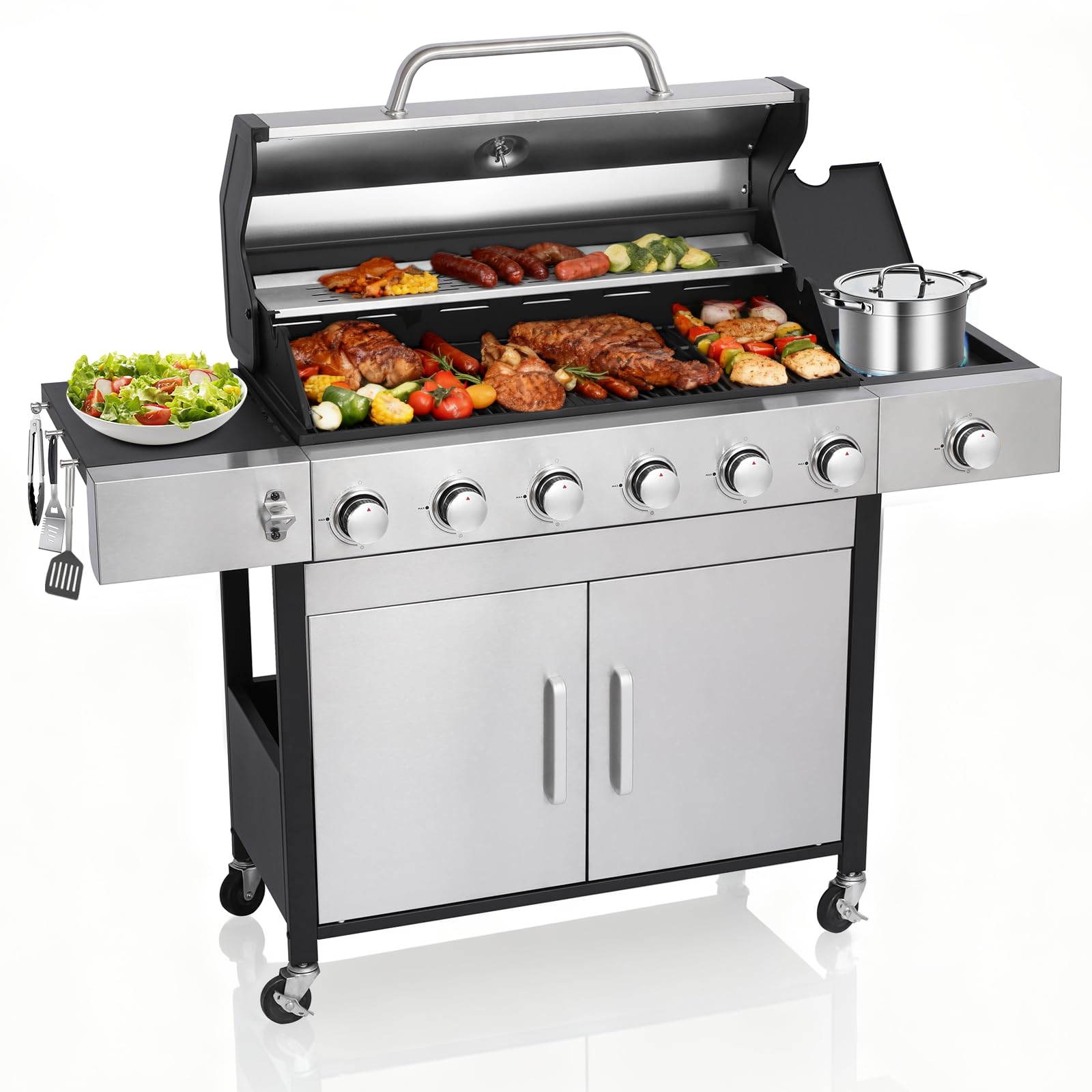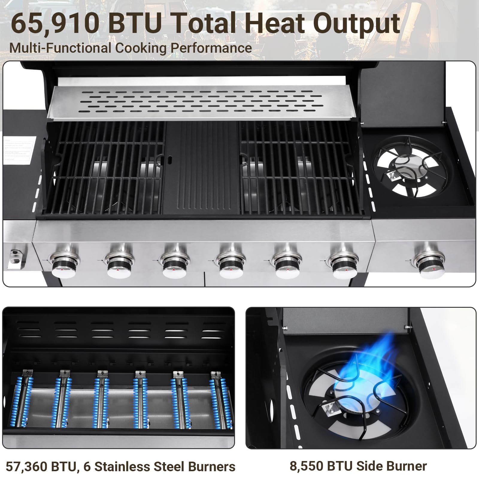 【High Heat Output】This outdoor gas grill features 6 main burners and 1 side burner, offering total 65,910 BTU for versatile cooking. The main burners are suitable for grilling, while the side burner is ideal for cooking pots
