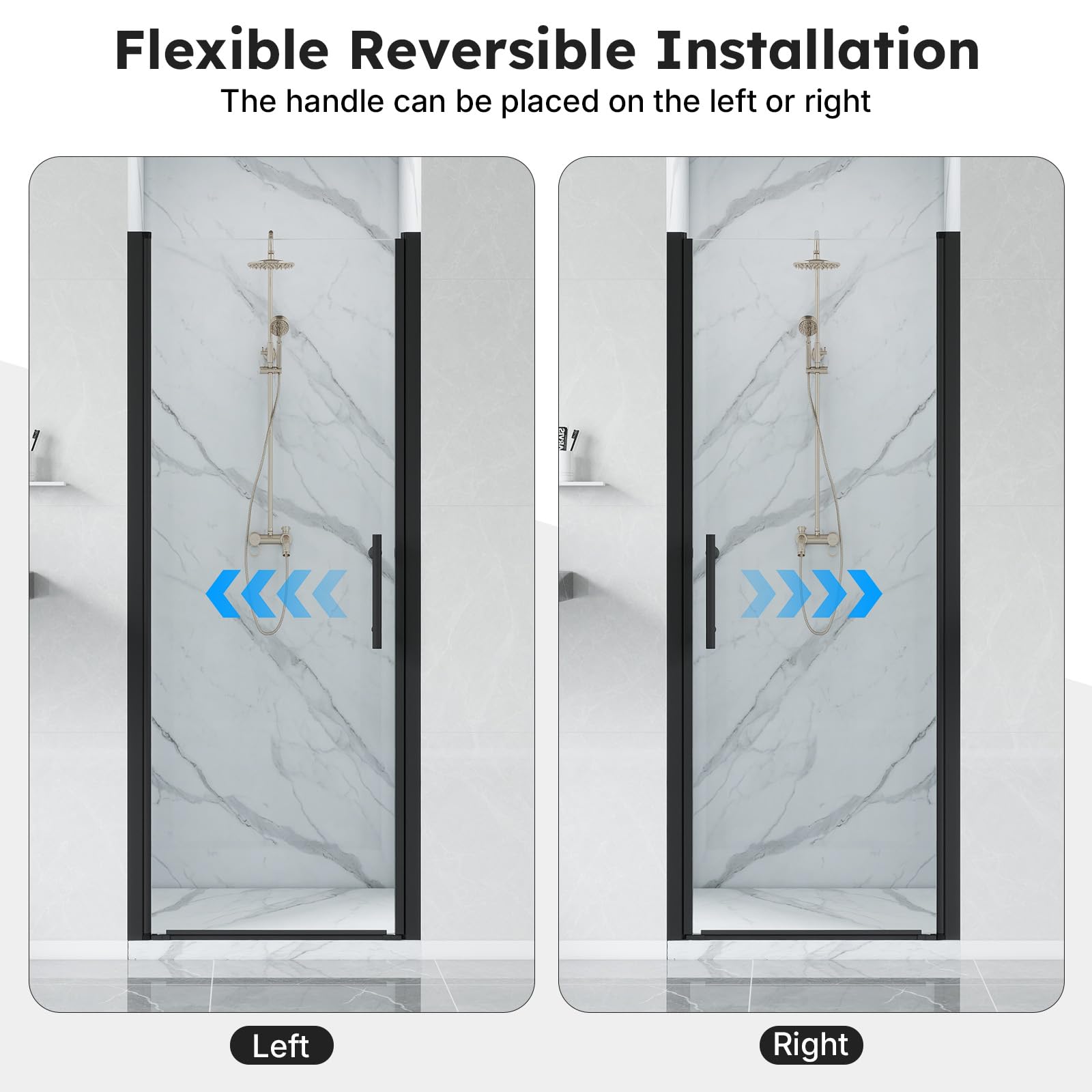 Adjustable 30-31.5" W x 75" H Semi-Frameless Pivot Shower Door, 1/4" (6mm) Clear Tempered Glass Shower Door, Pivot Swing Shower Glass Door, Reversible Installation, Black
