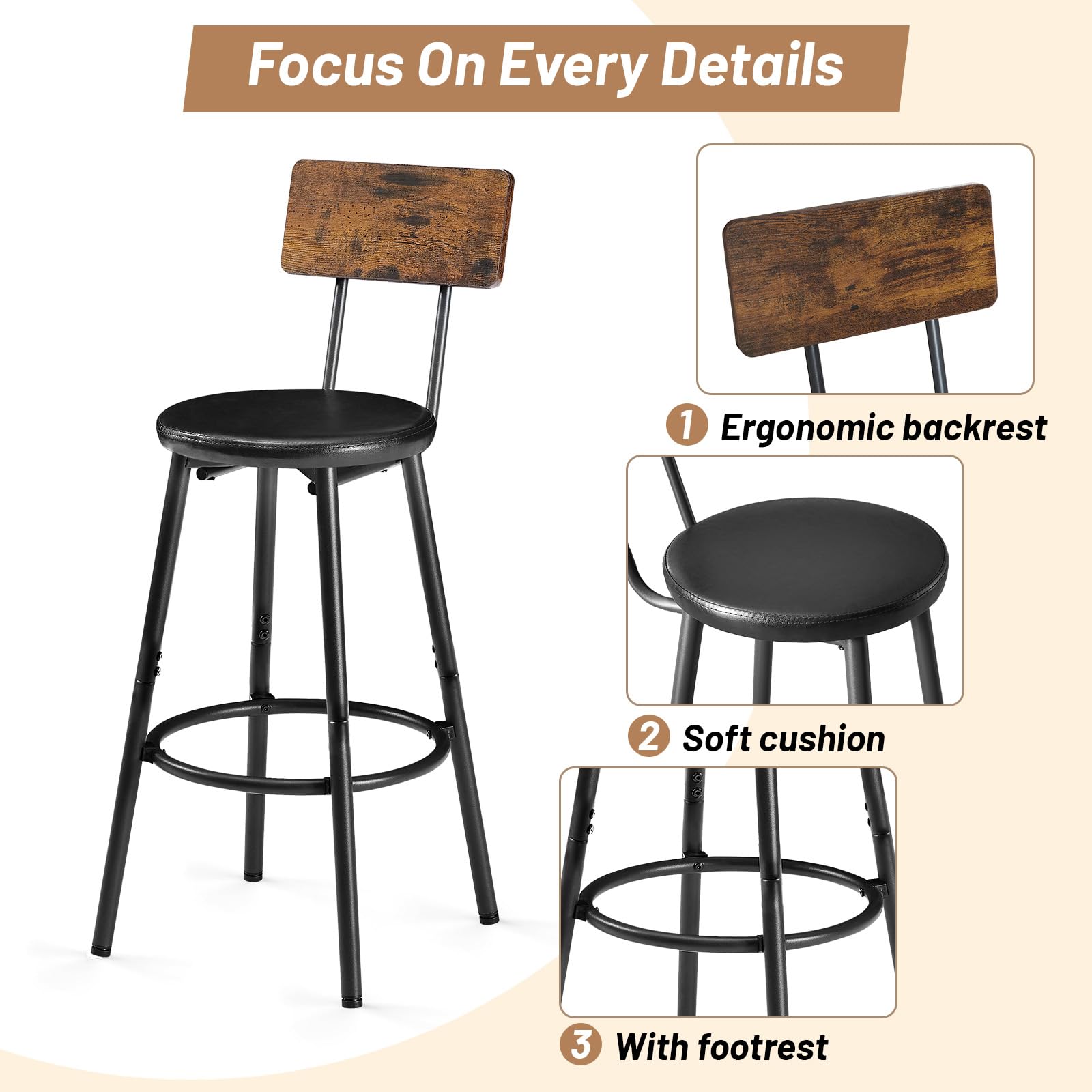 Ergonomic Comfort Design: The high chairs feature 13-inch wide PU leather upholstery and soft sponge cushion for a comfortable seating experience. The ergonomic looped footrest allows your legs to fully relax, reducing pressure from prolonged sitting. The wooden backrest provides additional support and helps alleviate back fatigue, offering lasting comfort even during extended use.