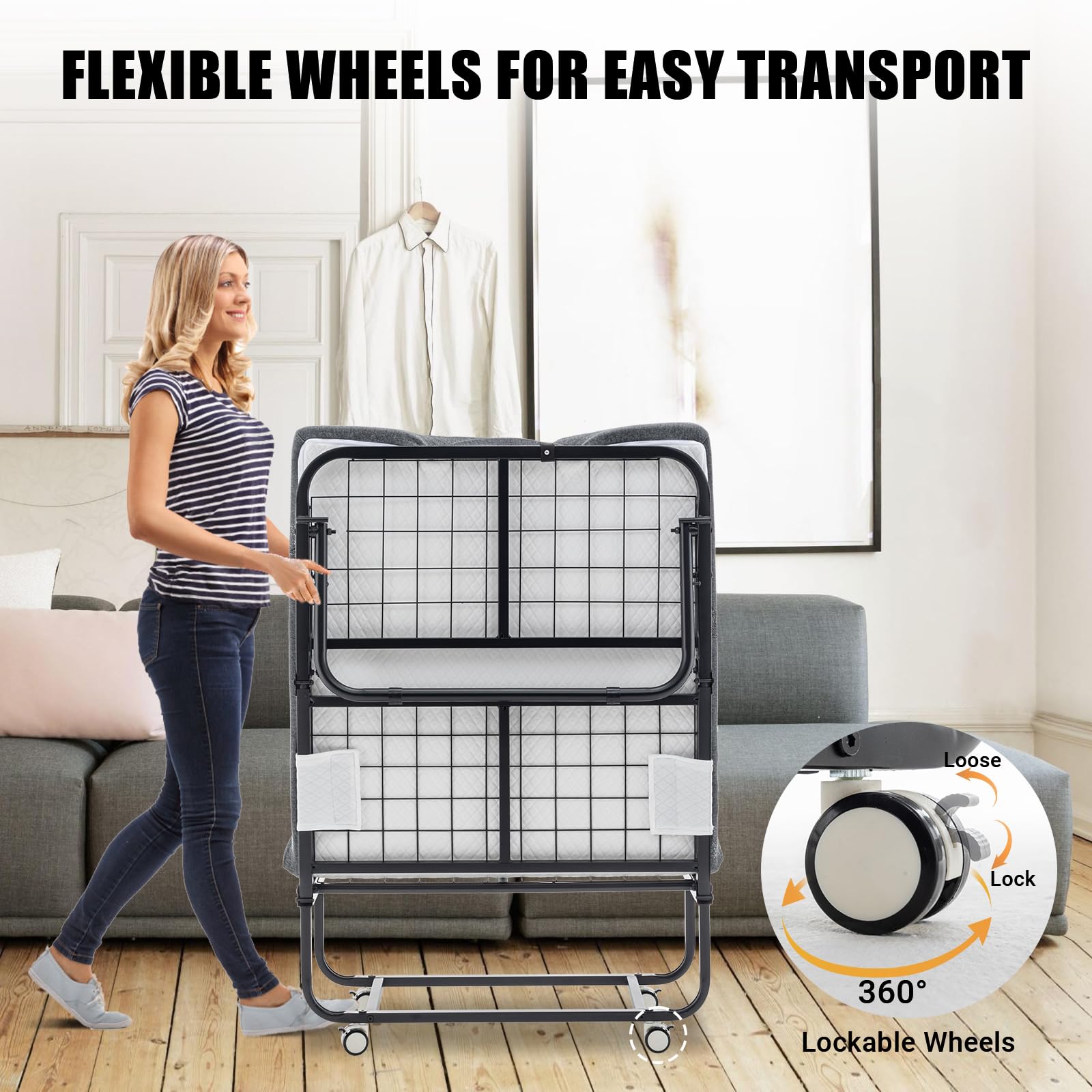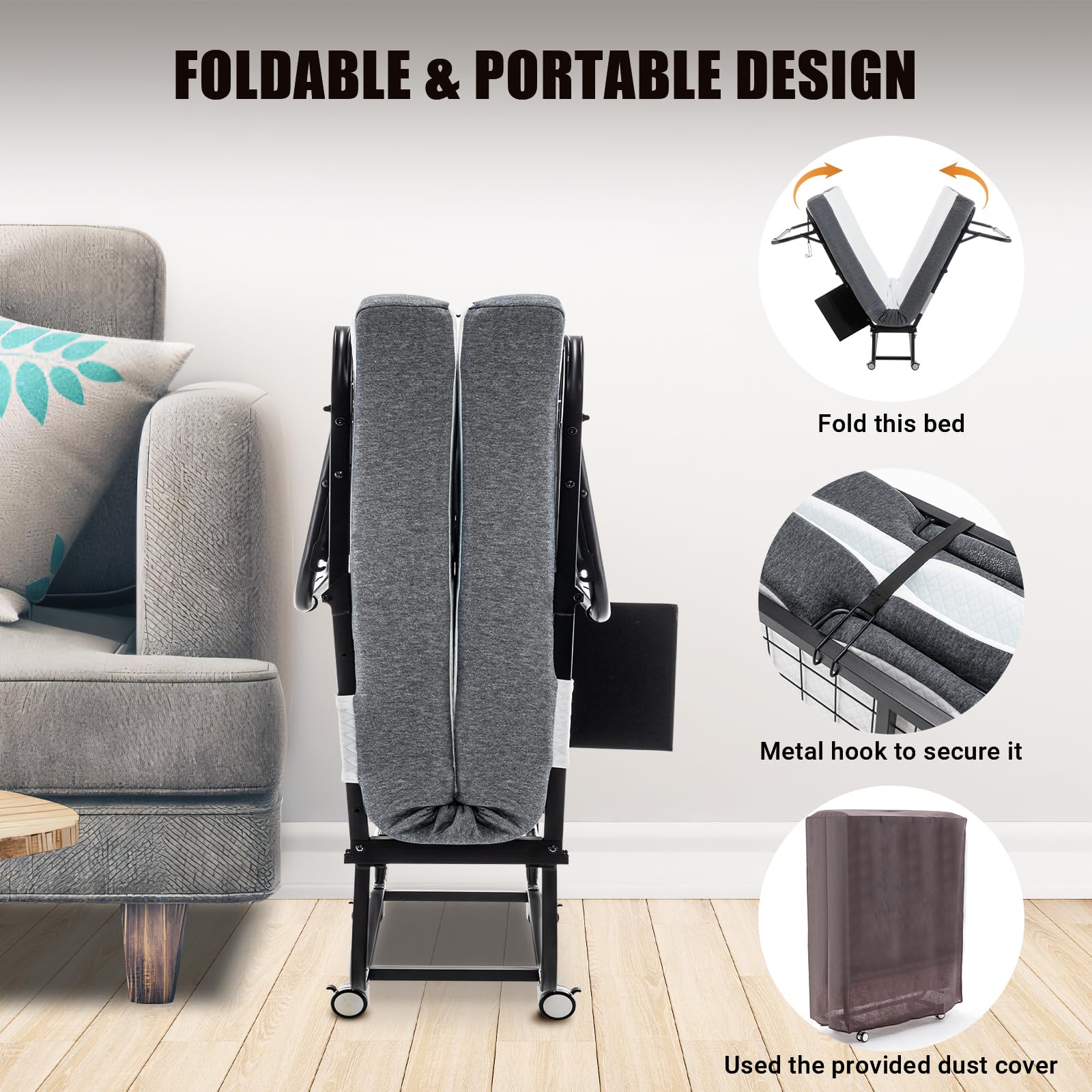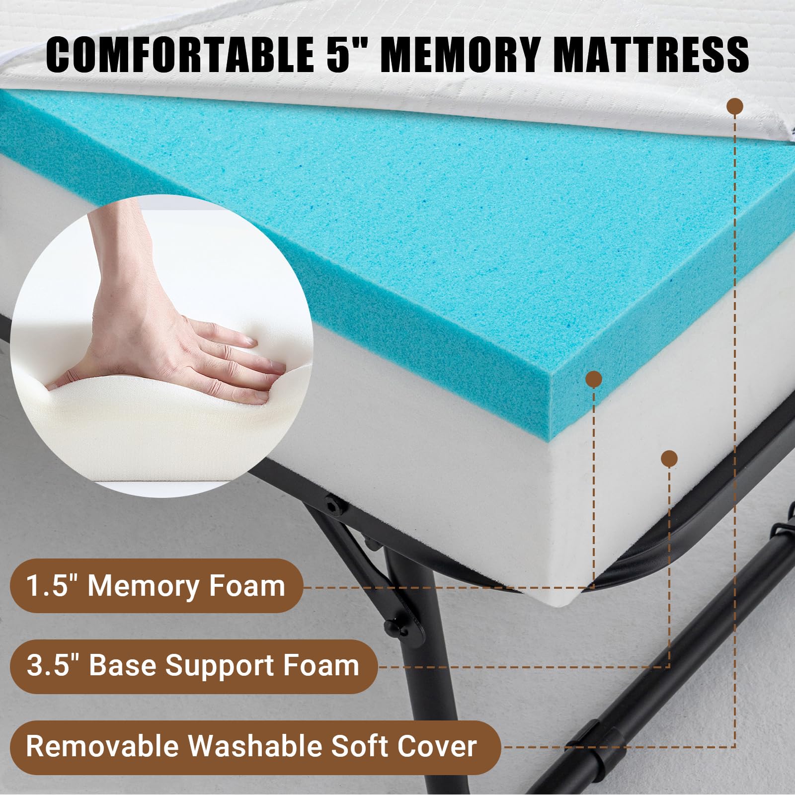 Folding Bed with 5" Mattress for Adults Portable Rollaway Bedframe for Guests, Strong Metal Frame 75” x 39” Black Gray
