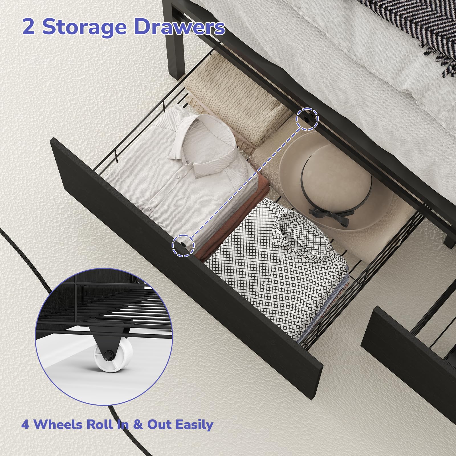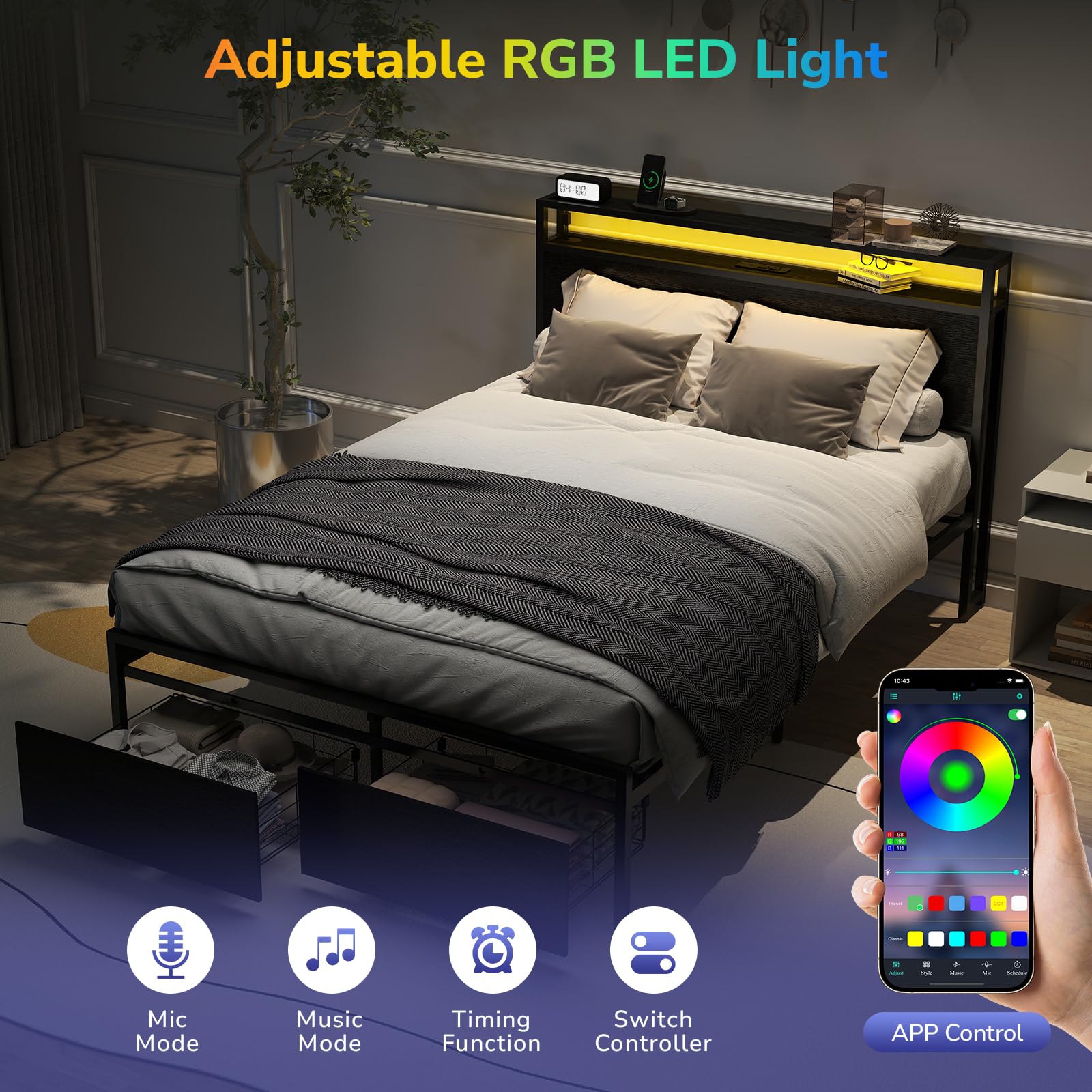 Full Bed Frame with 2 Storage Drawers, Bed Frame Full Size with Headboard, LED Light, Charging Station with 2 USB Ports & 2 AC Ports, Noiseless, Black