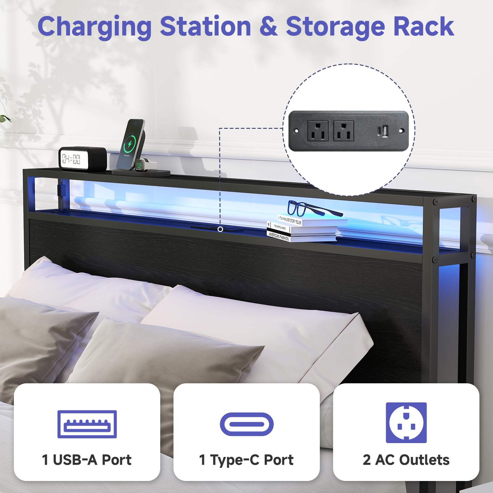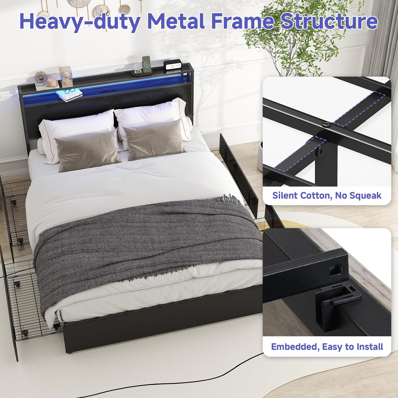 Full Bed Frame with 4 Storage Drawers, Full Size Bed Frame with Headboard, LED, Charging Station with USB Ports & AC Outlets, Sturdy Metal Slat Support, No Noise, Black