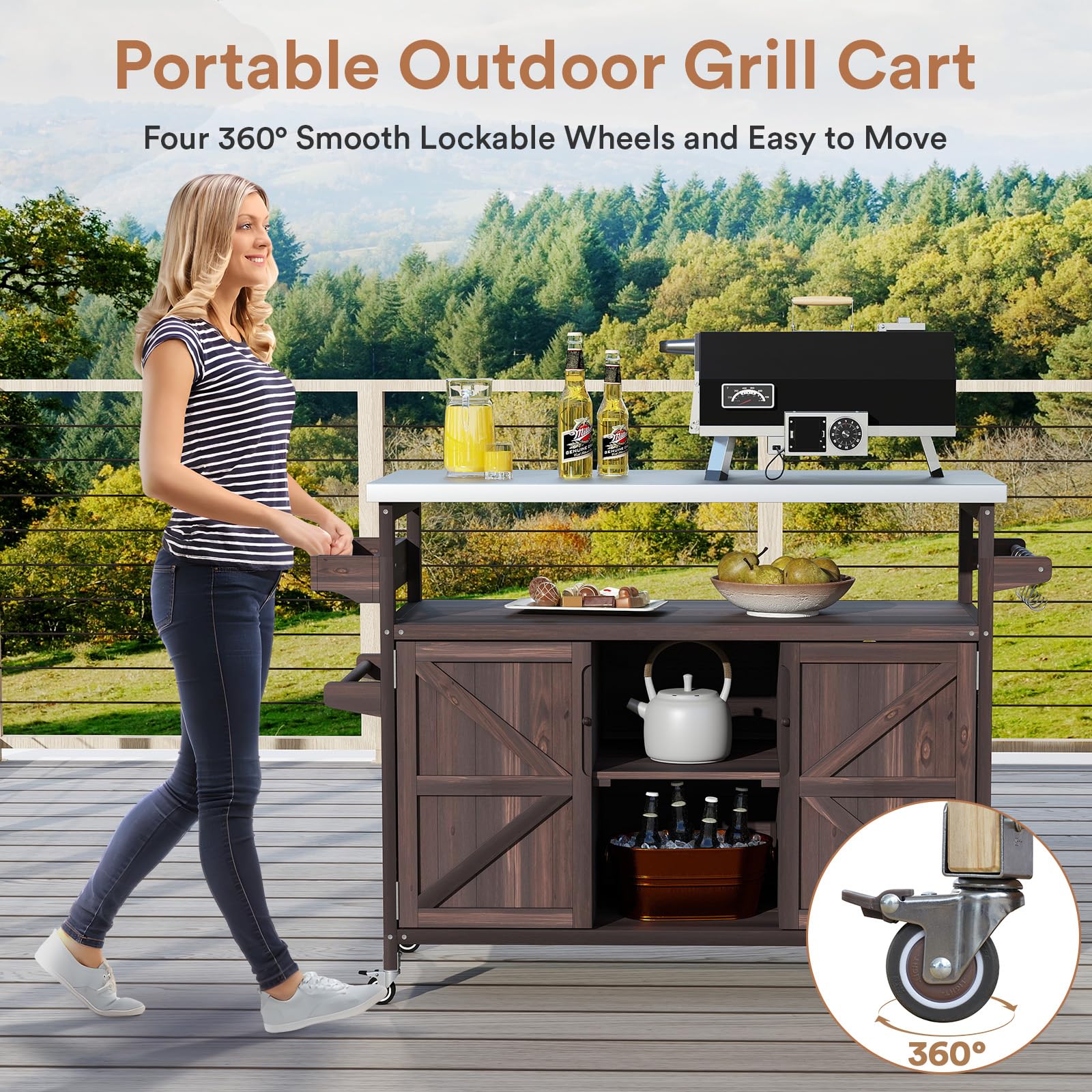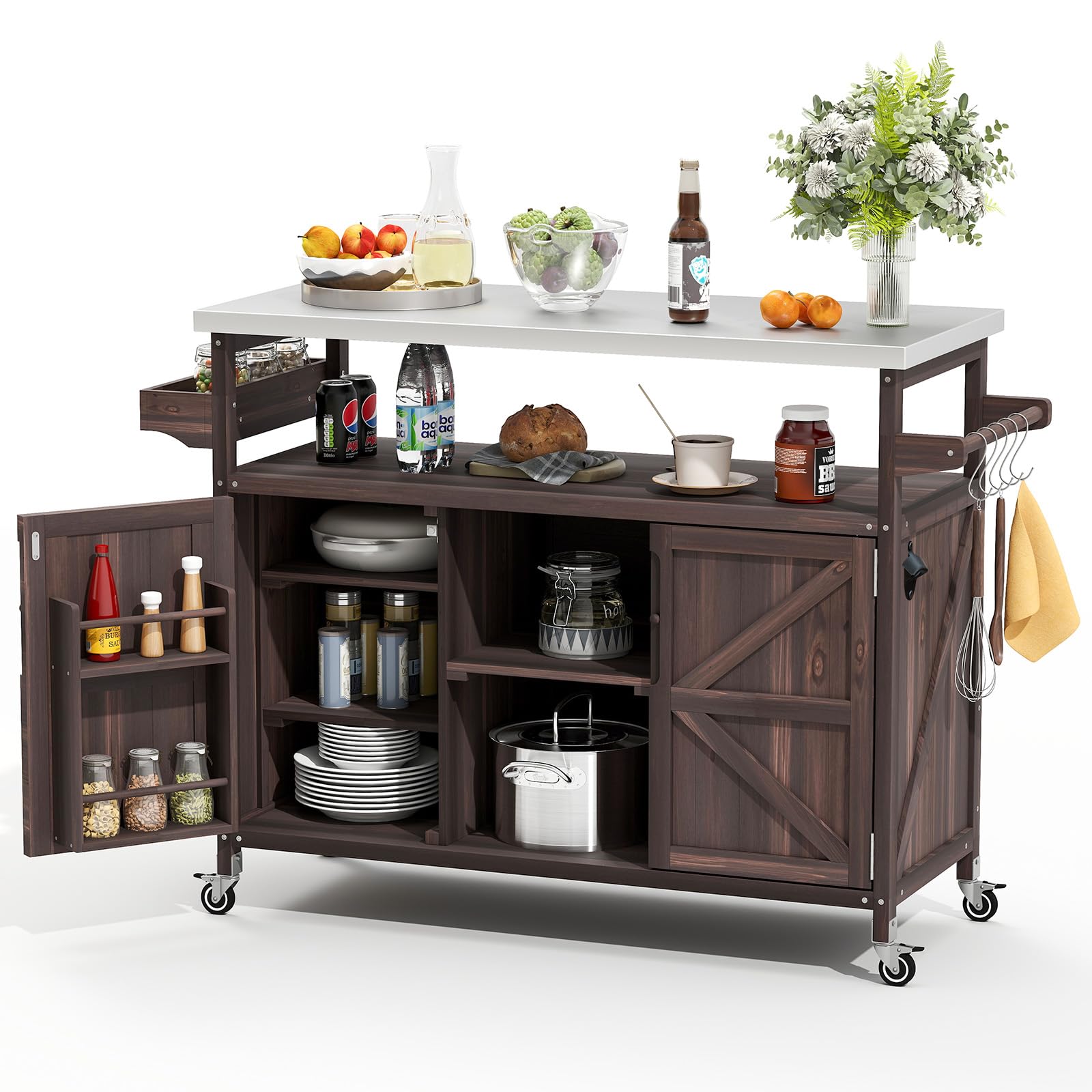 Outdoor Grill Cart with Storage Space, Stainless Steel Tabletop Outdoor Kitchen Island, Fir Wood Outdoor Buffet Cabinet with Lockable Casters for Grilling, Brown