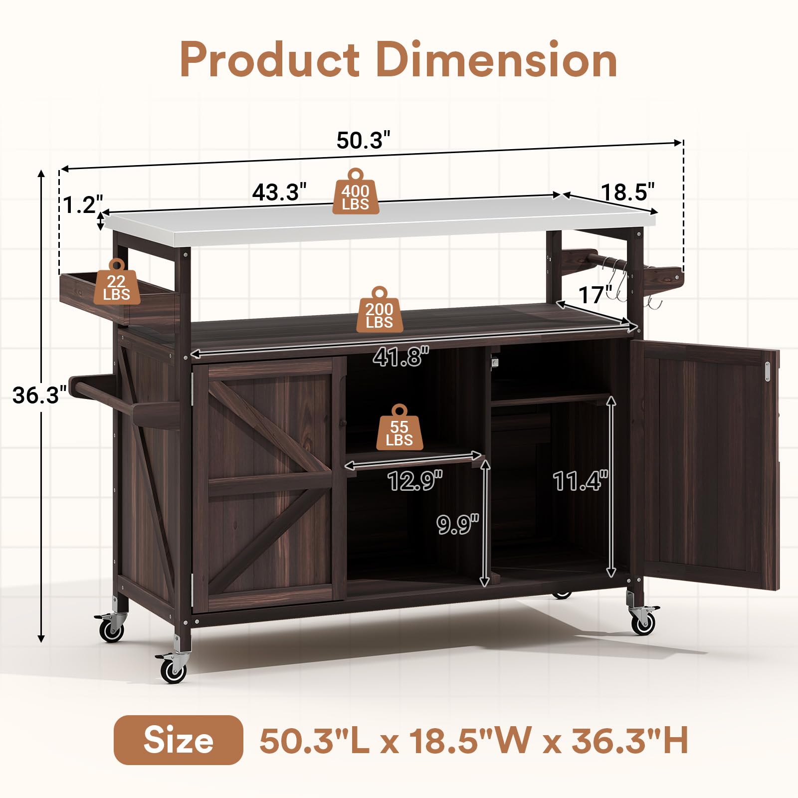 【Generous Work Area】With an 18.5" x 43.3" stainless steel top table, this outdoor kitchen cart gives you 801 sq inches of work area. Great for grilling, pizza ovens, or mixing drinks.The integrated exit hole allows setup for gas grill, and the spice rack and middle shelf offer easy storage