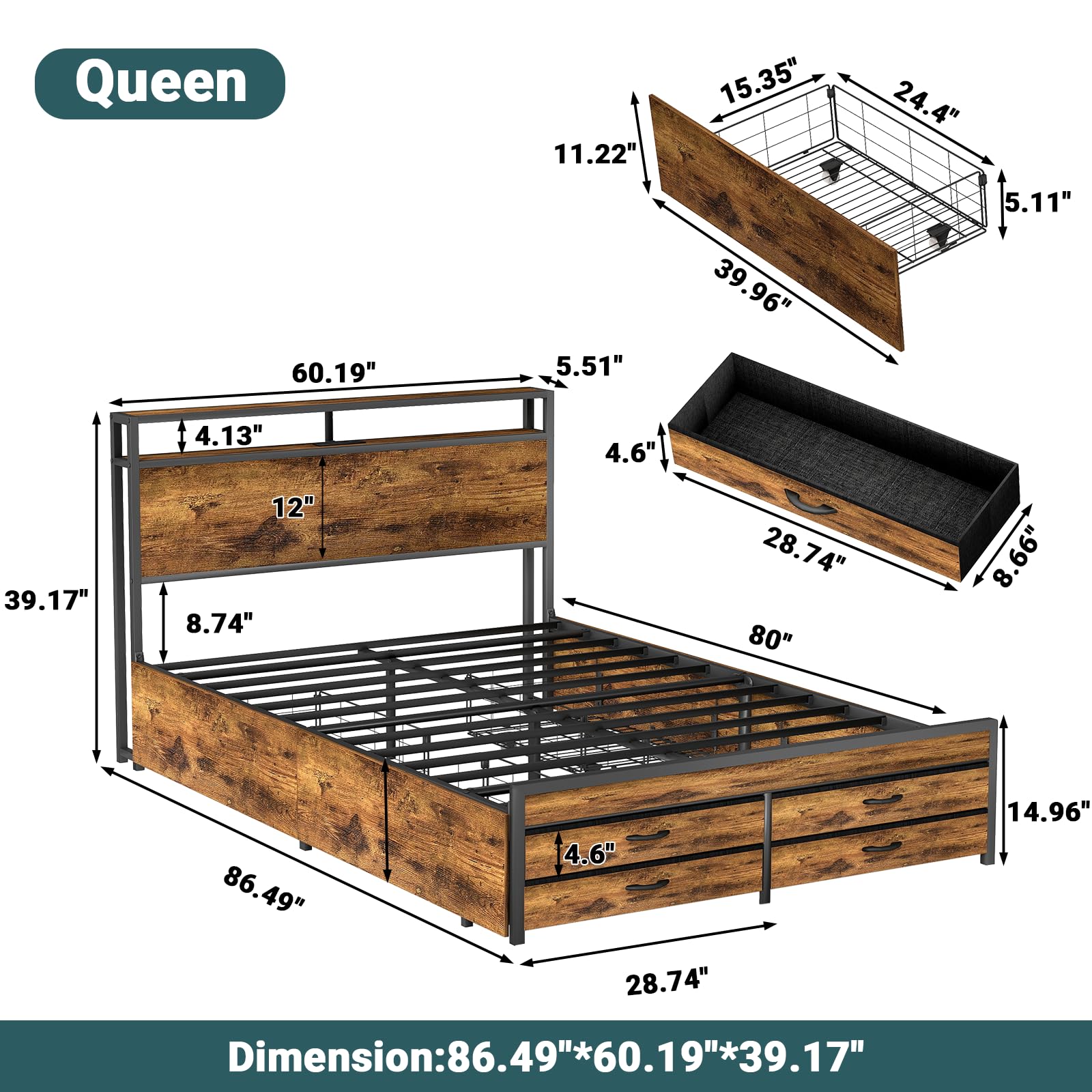 Queen Bed Frame with 8 Storage Drawers, Queen Metal Bed Frame with LED Light and Charging Station, Heavy Duty Metal Slats, No Box Spring Needed, Rustic Brown