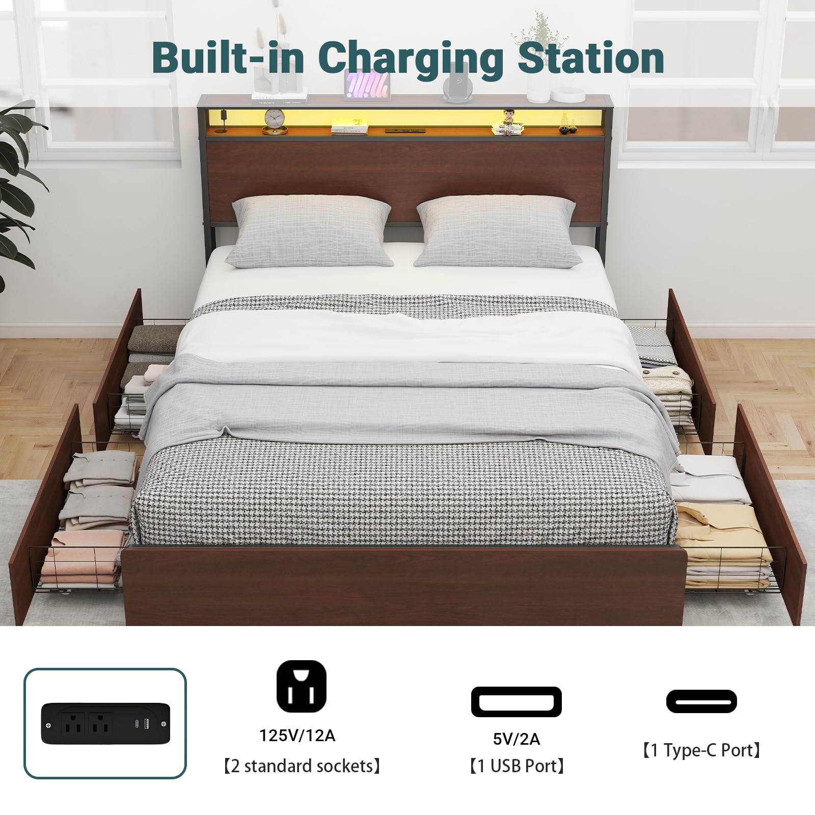 Queen Size Bed Frame with 4 Storage Drawers, Queen Platform Bed Frames with 2 Tier Storage Headboard, Charging Station, Adjustable LED Light, Noise-Free, No Box Spring Required, Reddish Brown