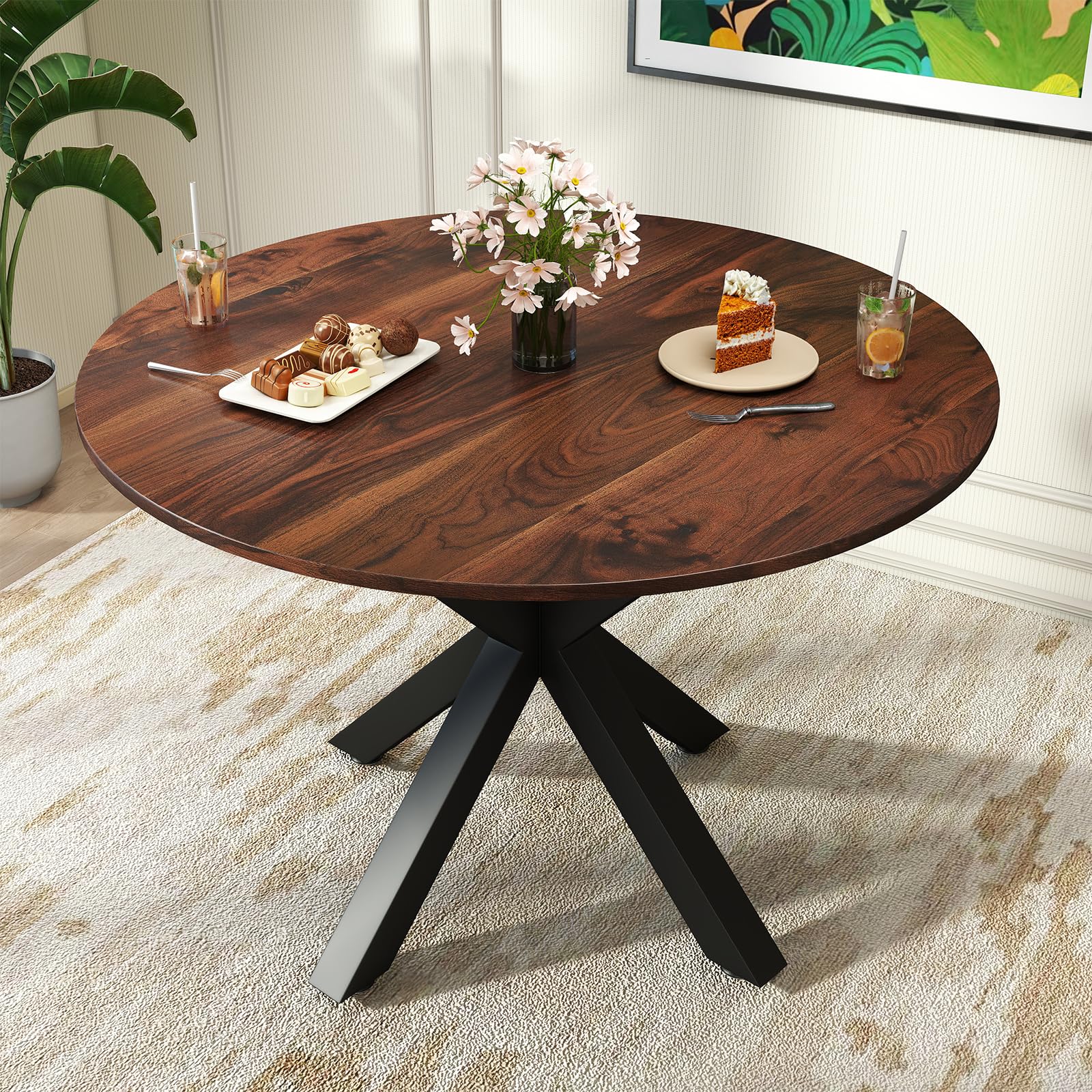 【Modern & Minimalist Design】This round dining table features a sleek circular shape that breaks away from rigid straight lines. Combining a wood tabletop with a sturdy metal frame, it easily complements various room styles, from modern to rustic.