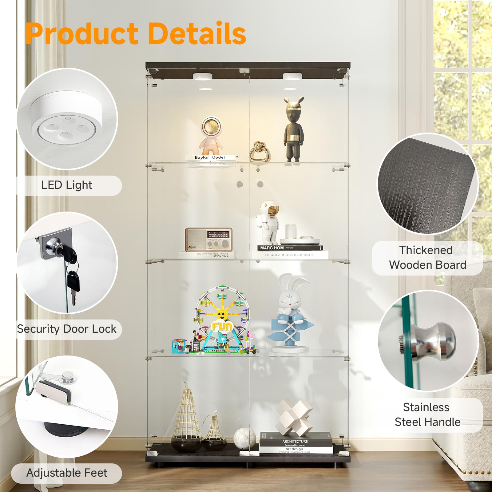 Tempered Glass Display Cabinet with Lights, 4-Tier Curio Cabinet with Glass Doors and Lock, Glass Display Case for Collectibles, for Living Room, Bedroom, Office, Black, Double Door