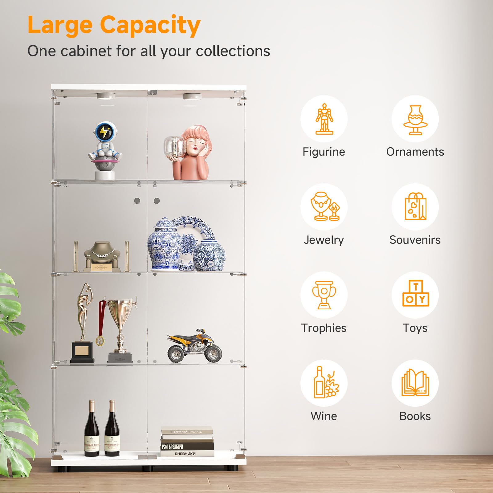 Tempered Glass Display Cabinet with Lights, 4-Tier Curio Cabinet with Glass Doors and Lock, Glass Display Case for Collectibles, for Living Room, Bedroom, Office, Double Door, White