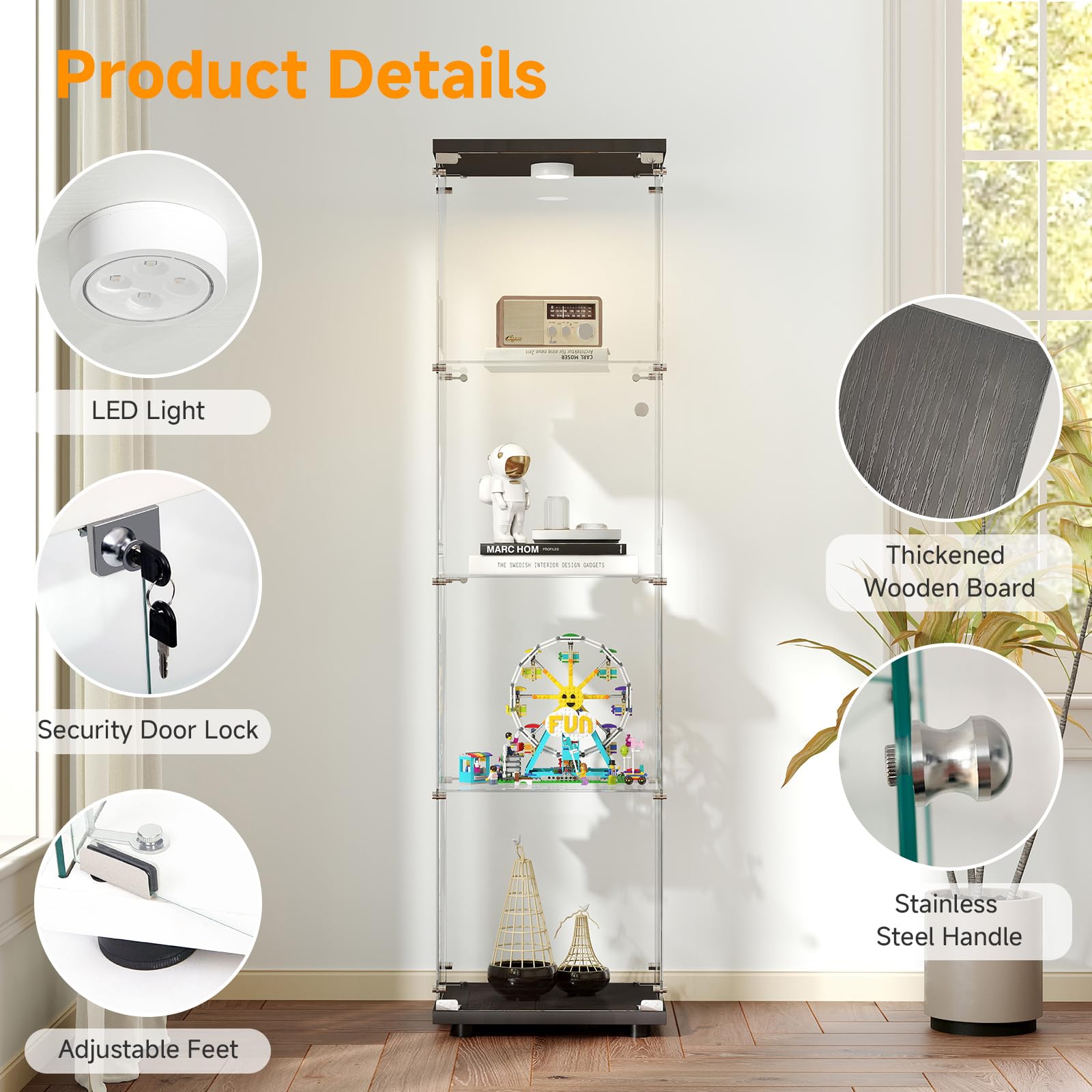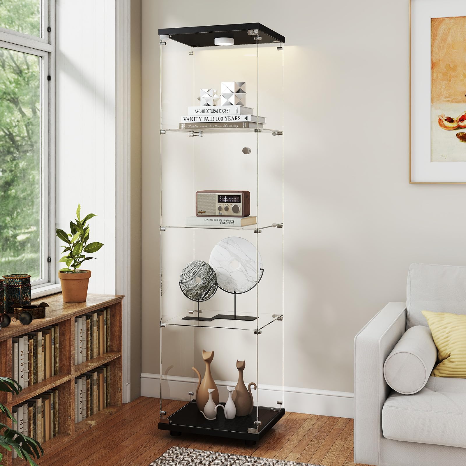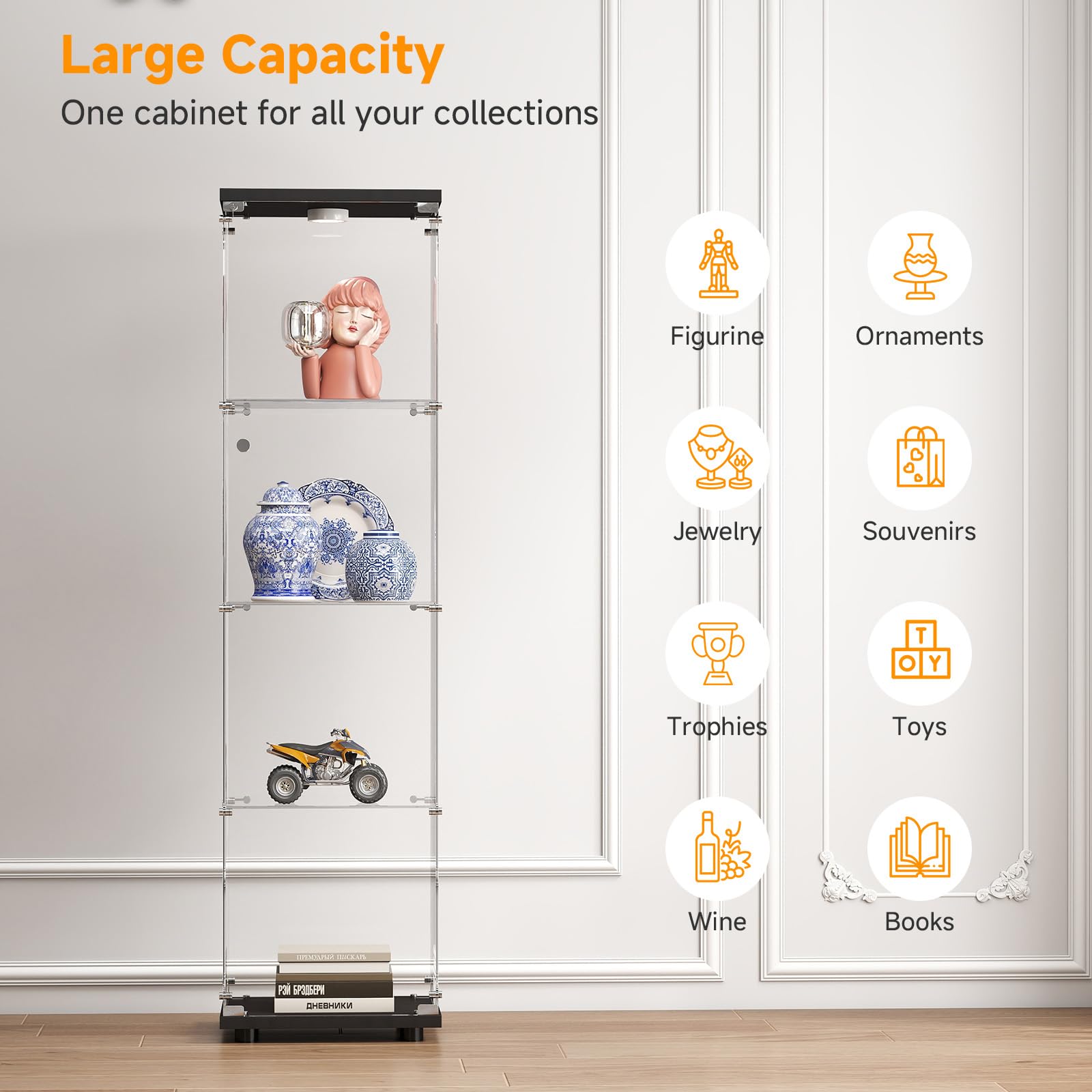 Tempered Glass Display Cabinet with Lights, 4-Tier Curio Cabinet with Glass Doors and Lock, Glass Display Case for Collectibles, for Living Room, Office, Bedroom, Single Door, Black