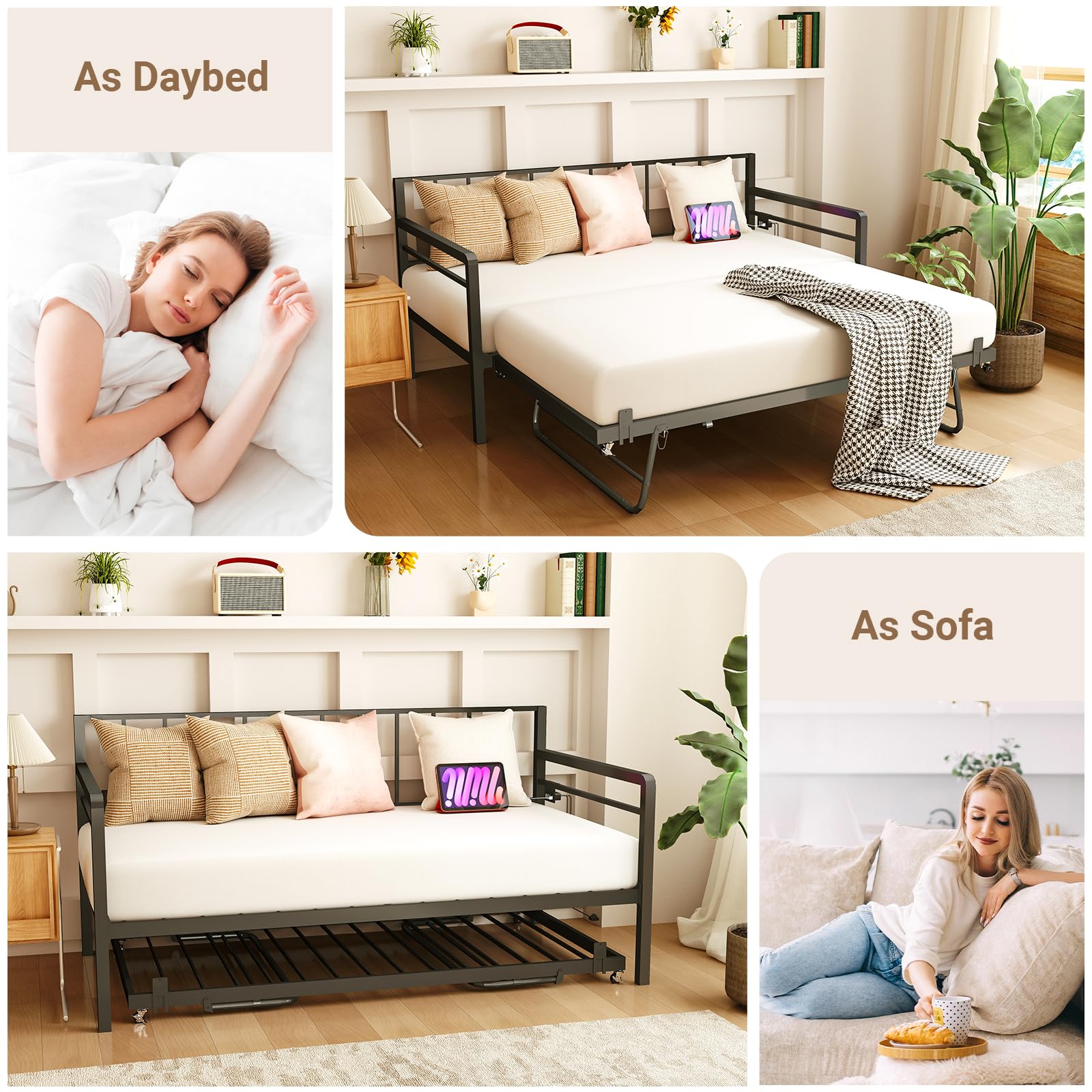 Twin Daybed with Pop Up Trundle, Metal Day Bed Frame with LED Lights and Charging Station, Day Bed with Trundle Bed Twin, Black Daybed for Living Room, Bedroom, Guest Room