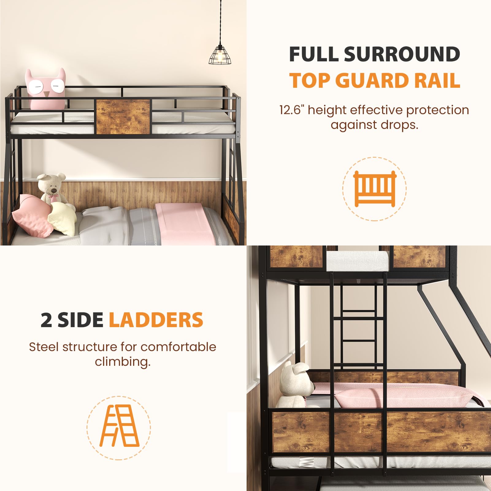 Twin Over Full Bunk Bed with Trundle, Metal Triple Bunk Bed with Full Length Guardrail 2 Side Ladders Thickened Bed Frame for Boys Girls Adults Loft, No Box Spring Needed, Black