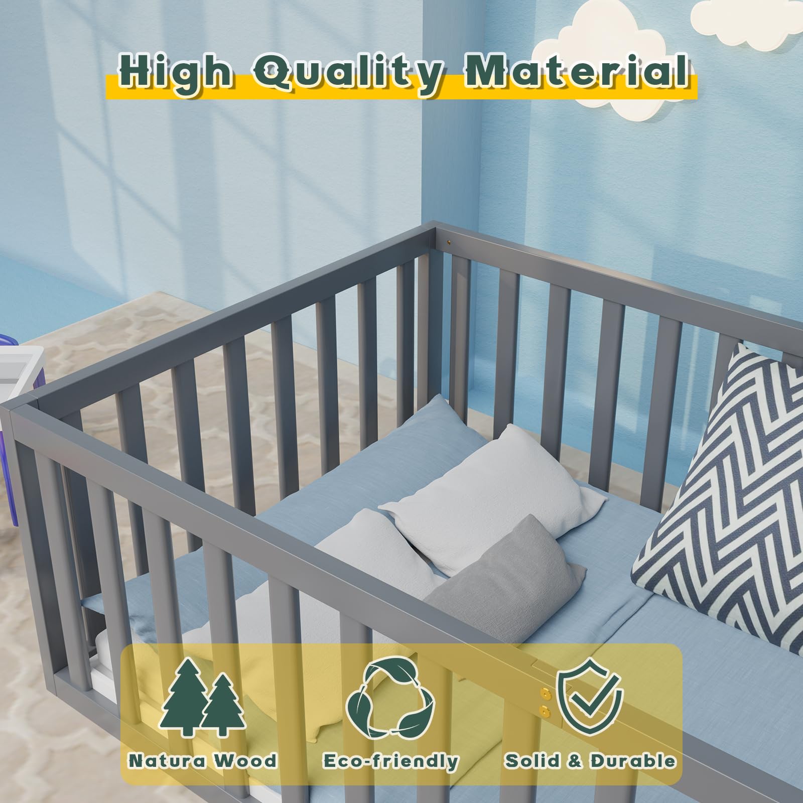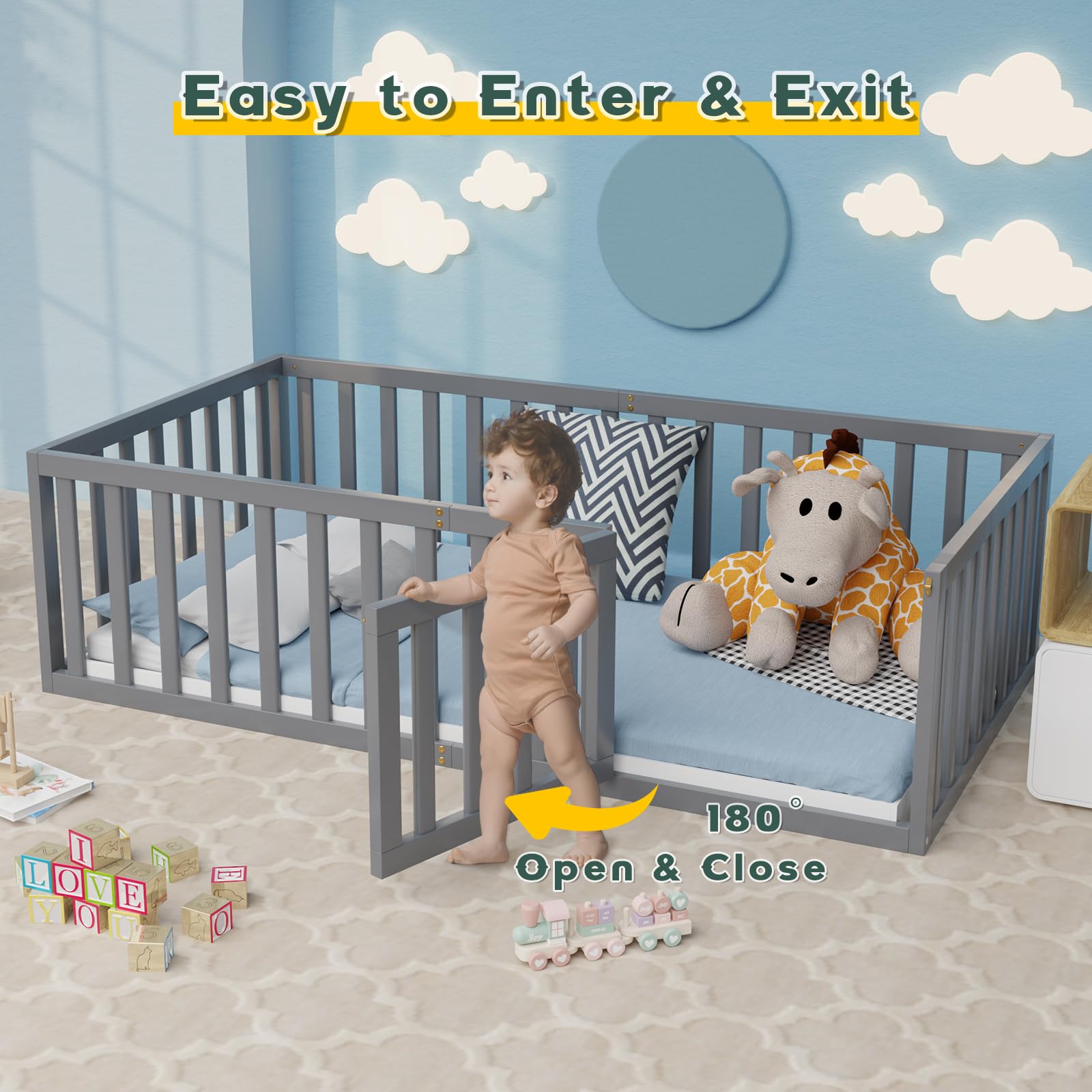 【Floor Bed for Kids】The wooden floor bed frame has a fence-shaped guardrail, providing your child with a safer sleeping and playing space. Specially designed doors allow your child to easily enter and exit while playing.