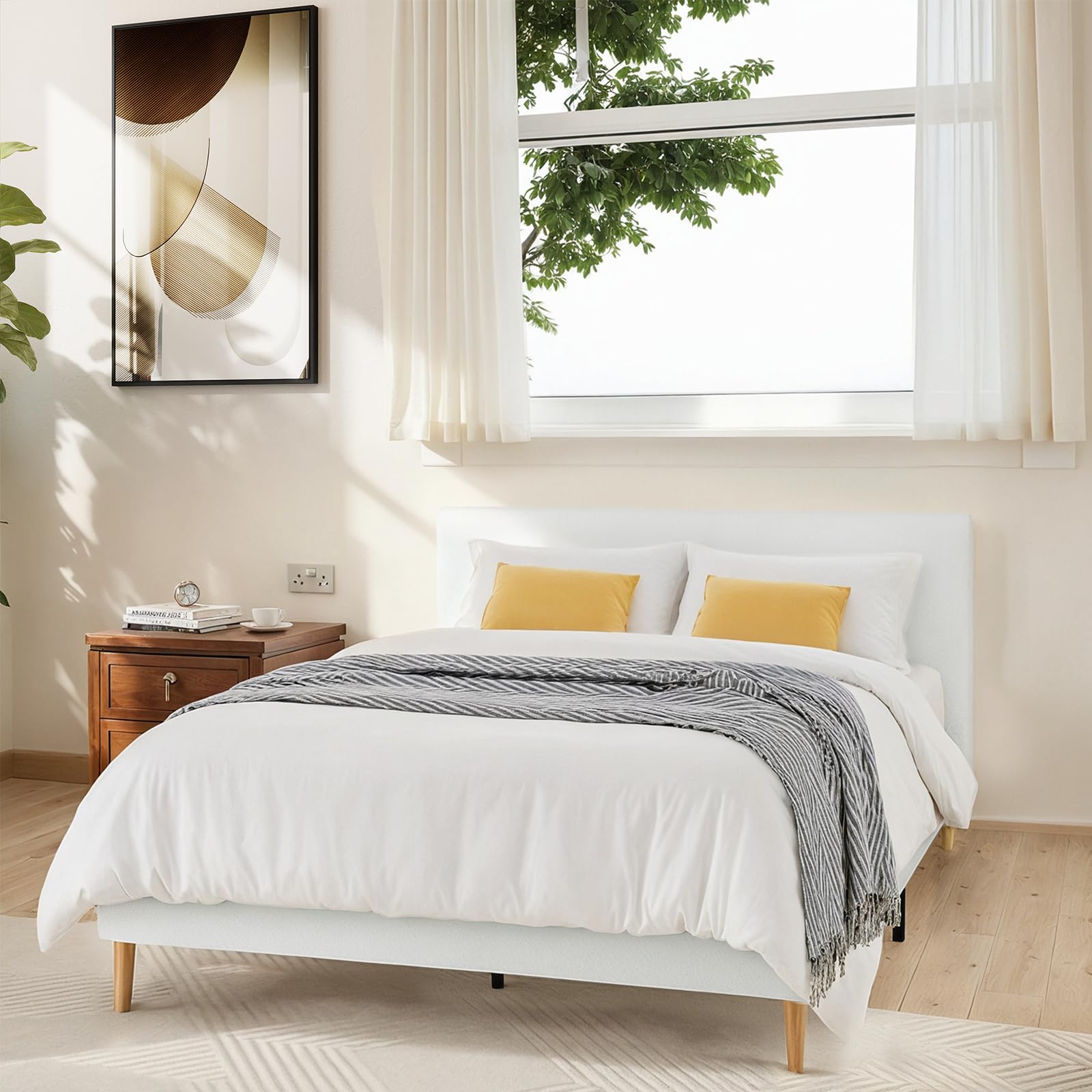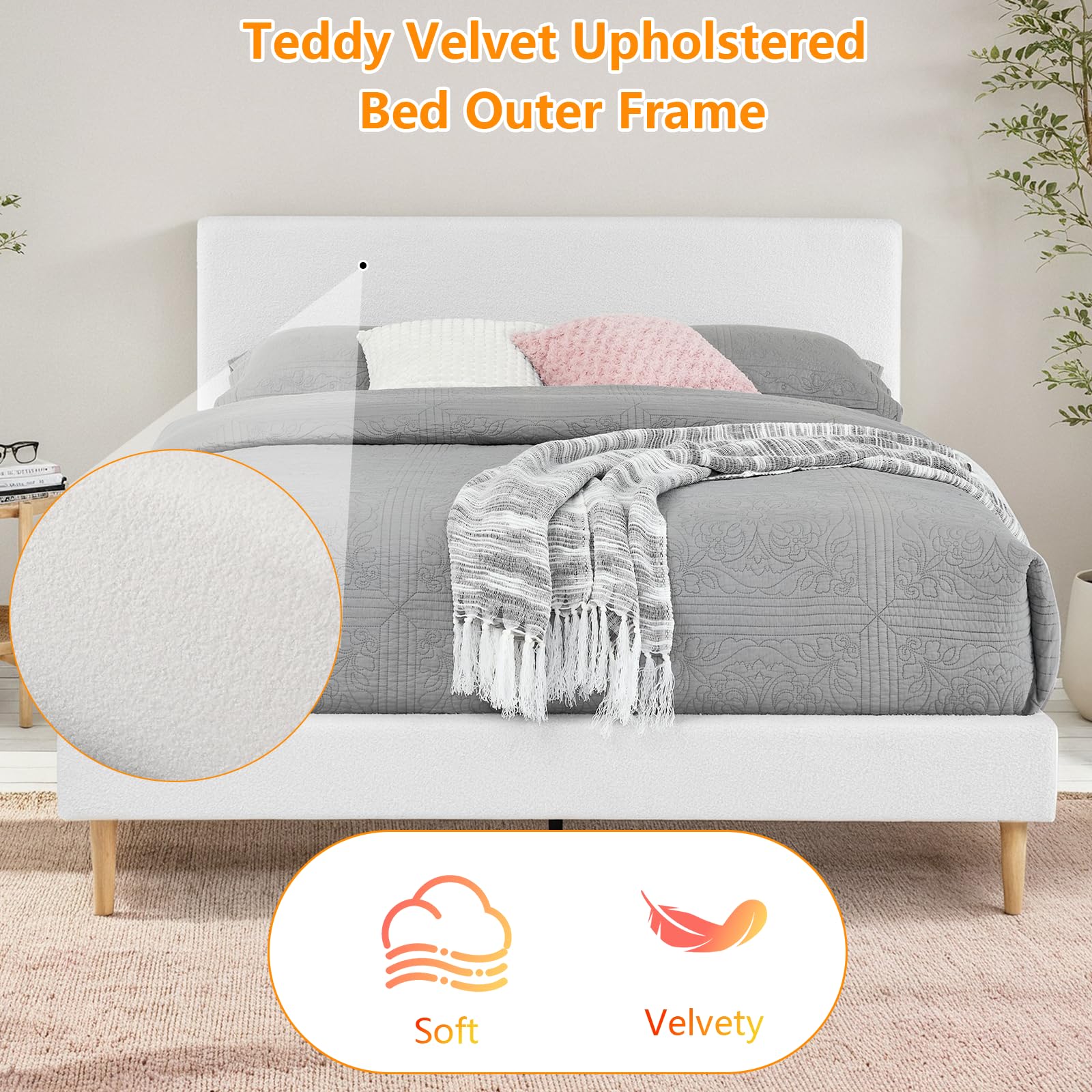 Upholstered Bed Frame Full/Queen, Velvet Upholstered Bed Frame with Headboard, Mattress Foundation with Sturdy Wooden Slats, No Box Spring Needed, No Noise, White