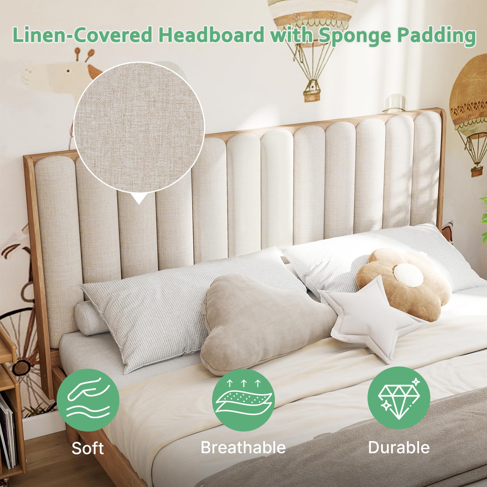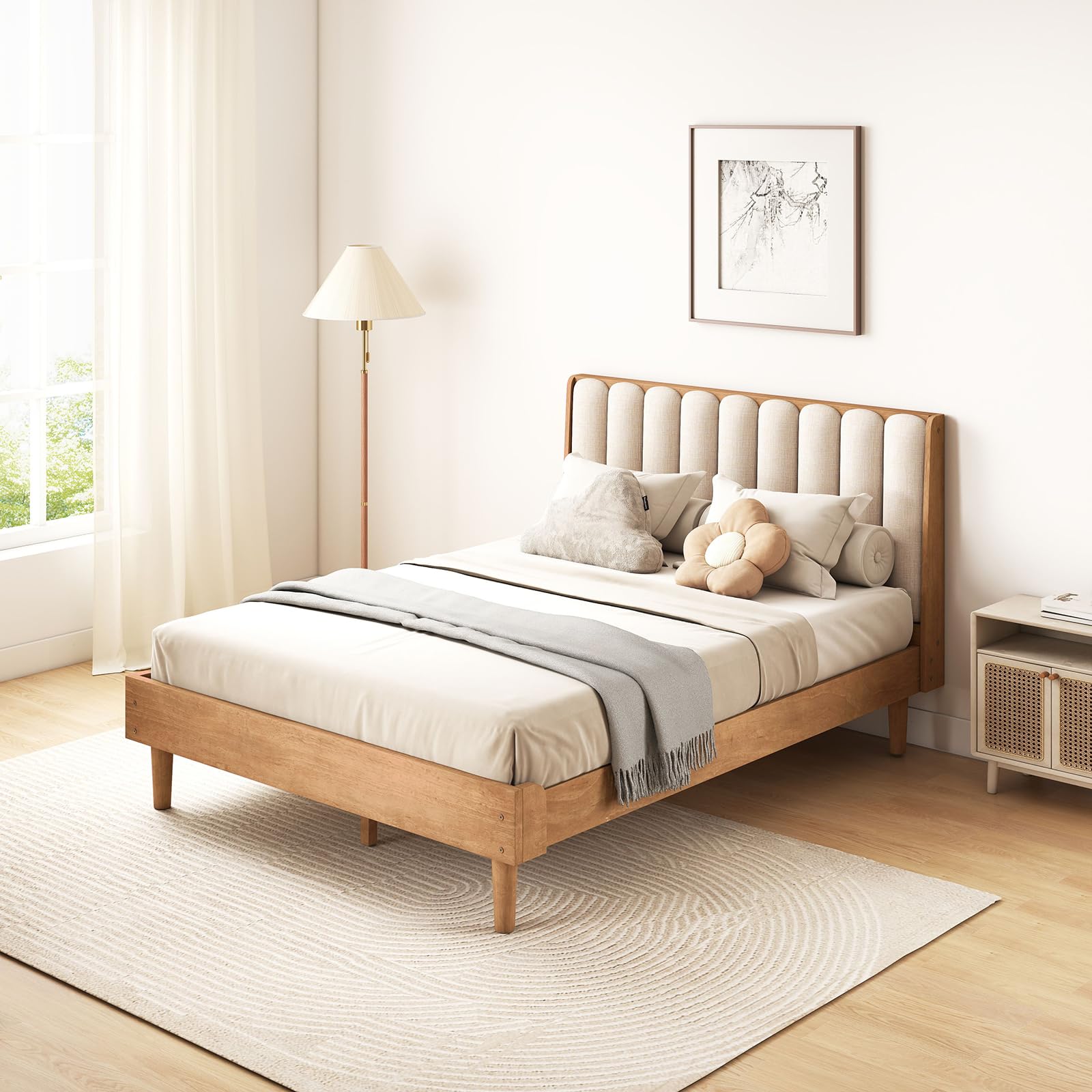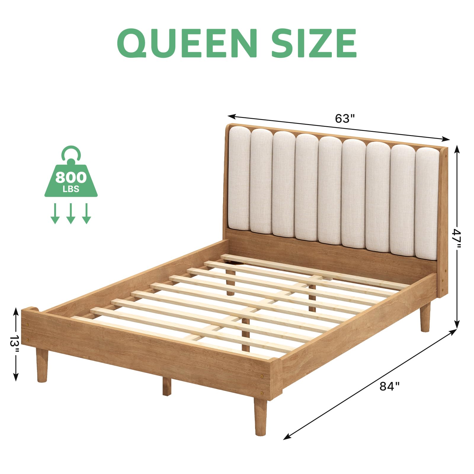 Wood Queen/King Bed Frame with Piano Key Style Upholstered Headboard, Sturdy Solid Wood Framework & Wooden Slat Support, No Box Spring Required, Wheat