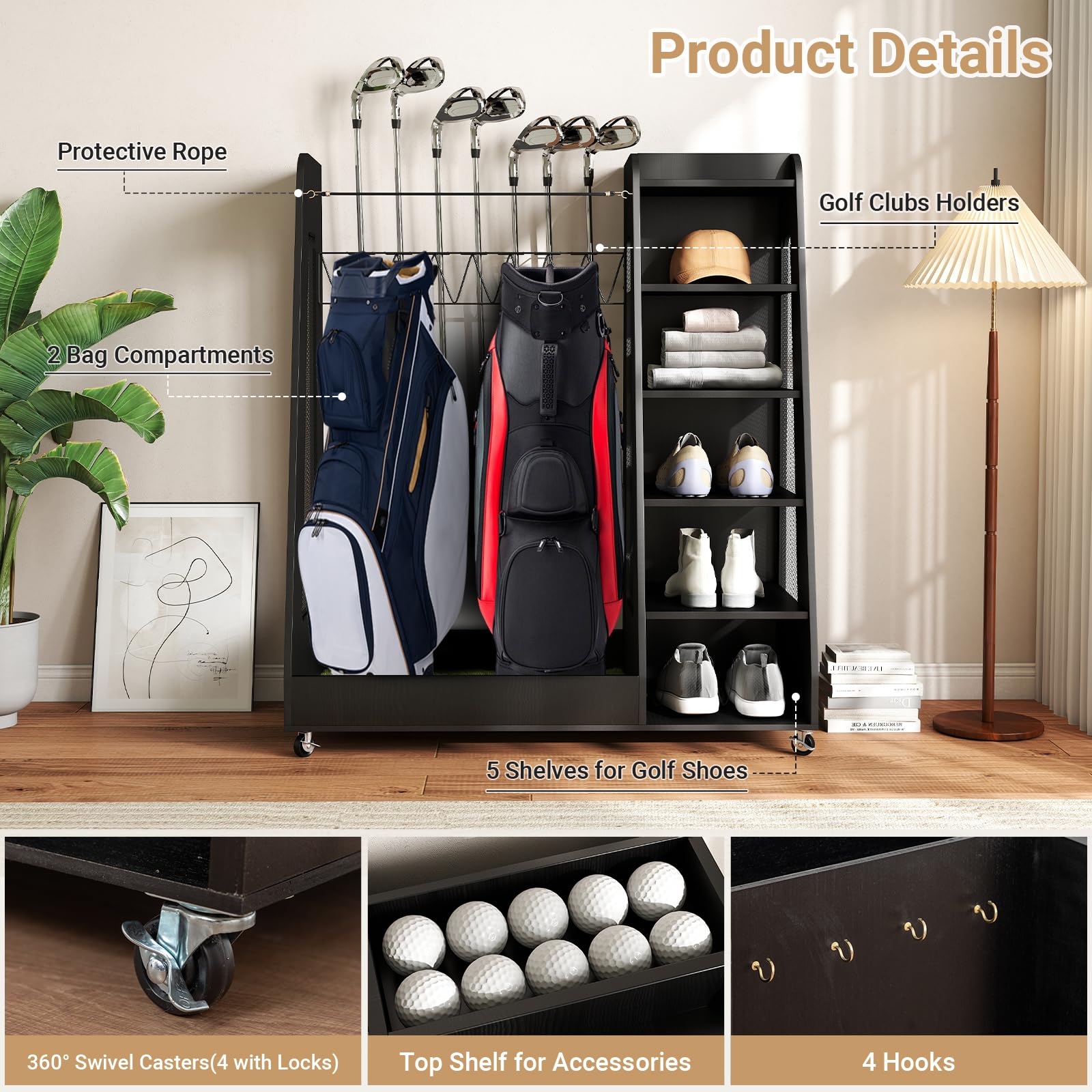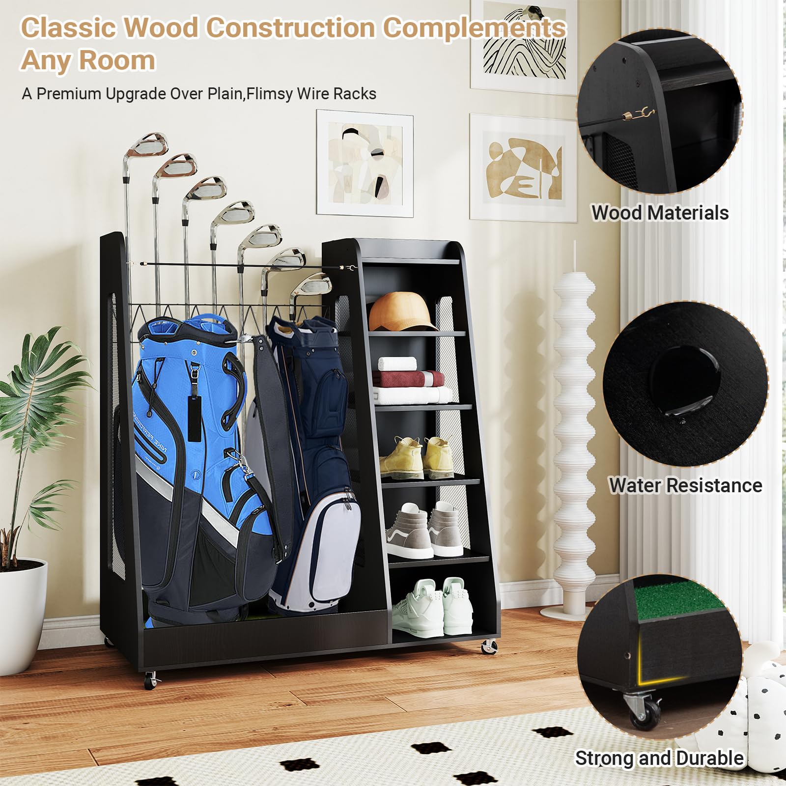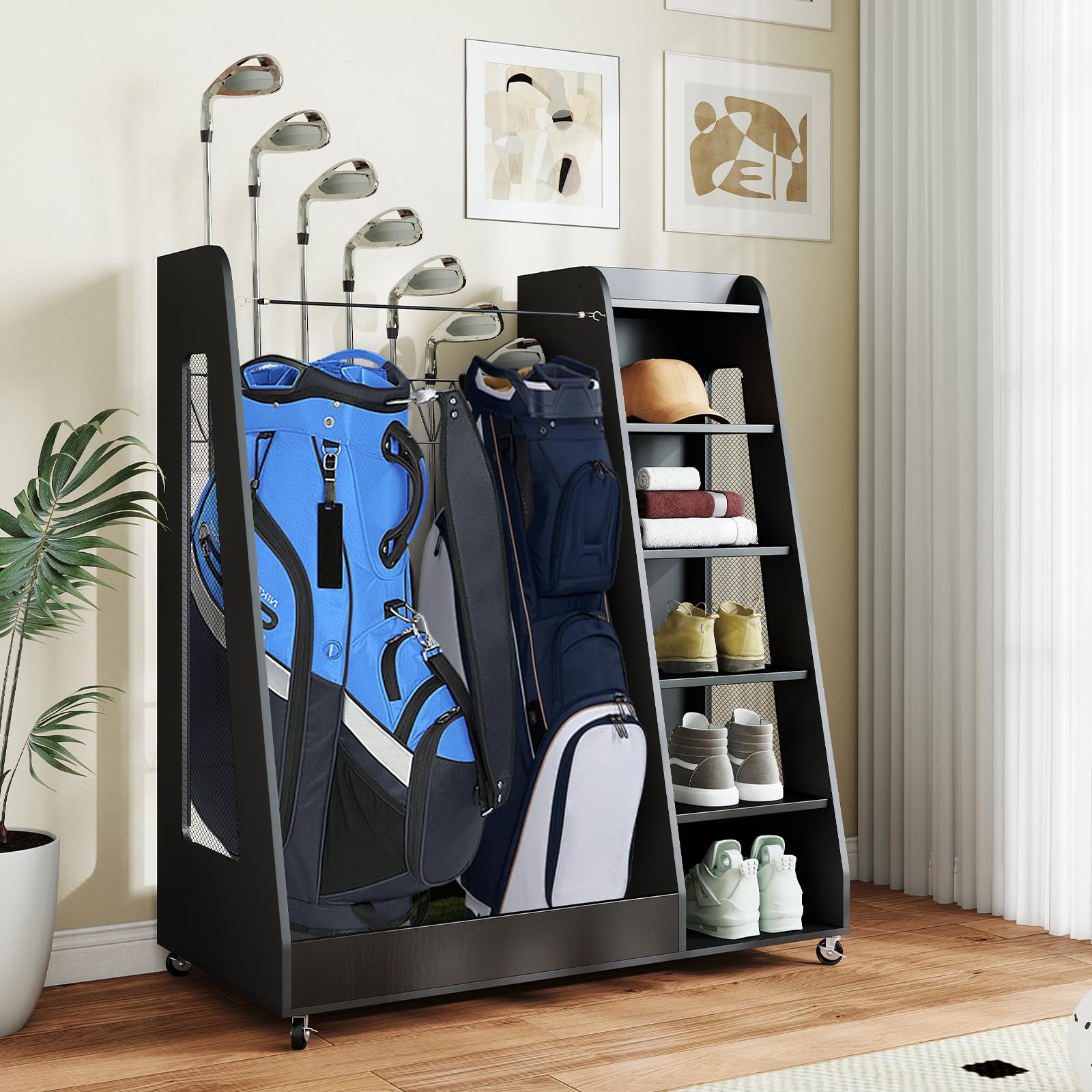 【Smooth Rolling & Lock-in Stability】Easily move your golf bag organizer with four heavy-duty 360° swivel wheels — Ideal for transitioning between indoor and outdoor use. Once positioned, two lockable wheels keep the rack securely in place. The wheeled design not only adds mobility but also makes cleaning and rearranging your space hassle-free