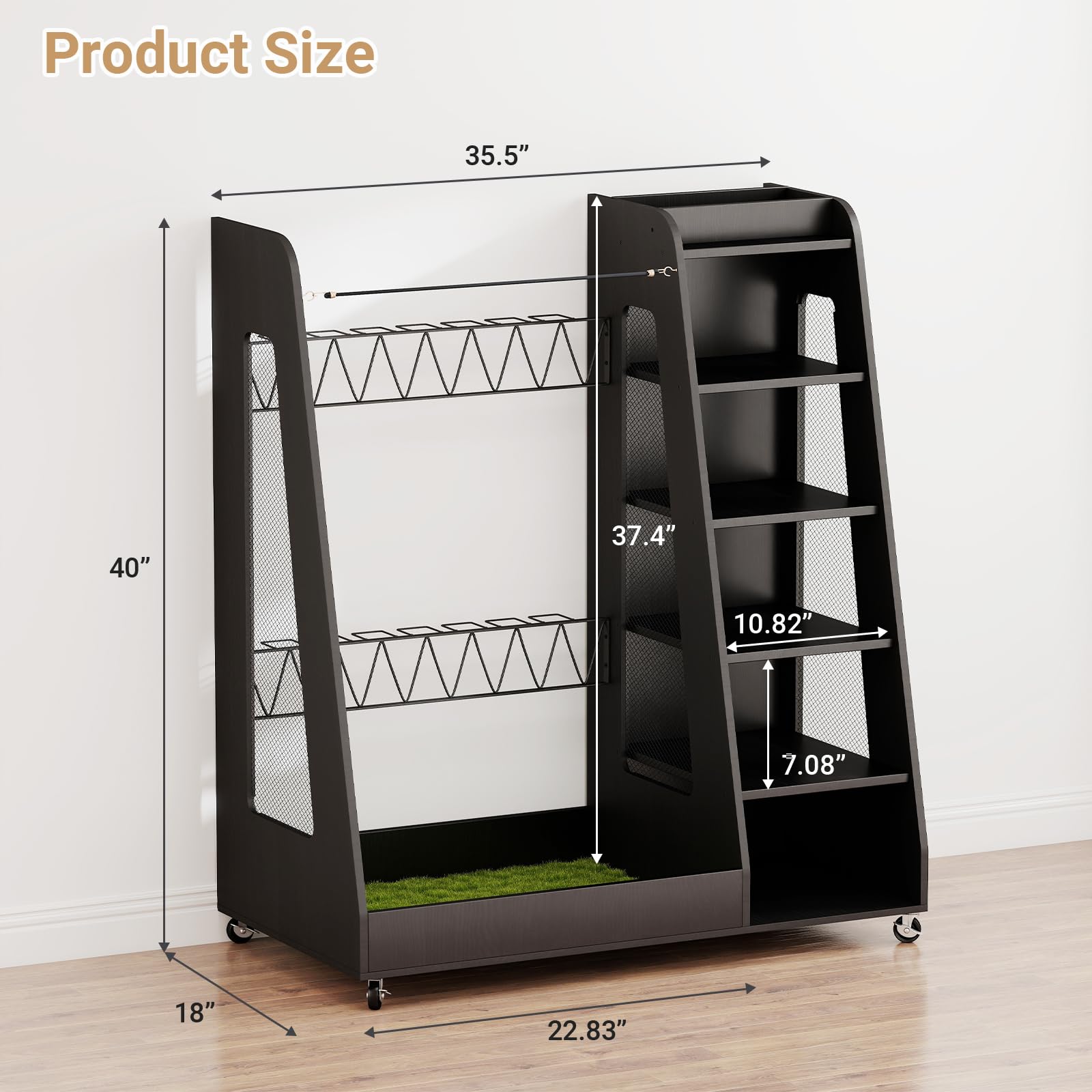 【All-in-One Golf Storage Solution】Measuring 35.5" L × 18" W × 40" H, this golf storage rack is designed to keep all your gear in one place. It holds 2 golf bags, 7 clubs, 4–5 pairs of shoes, and golf balls. Built-in hooks on the back are ideal for hanging your golf clothes, helping you stay organized