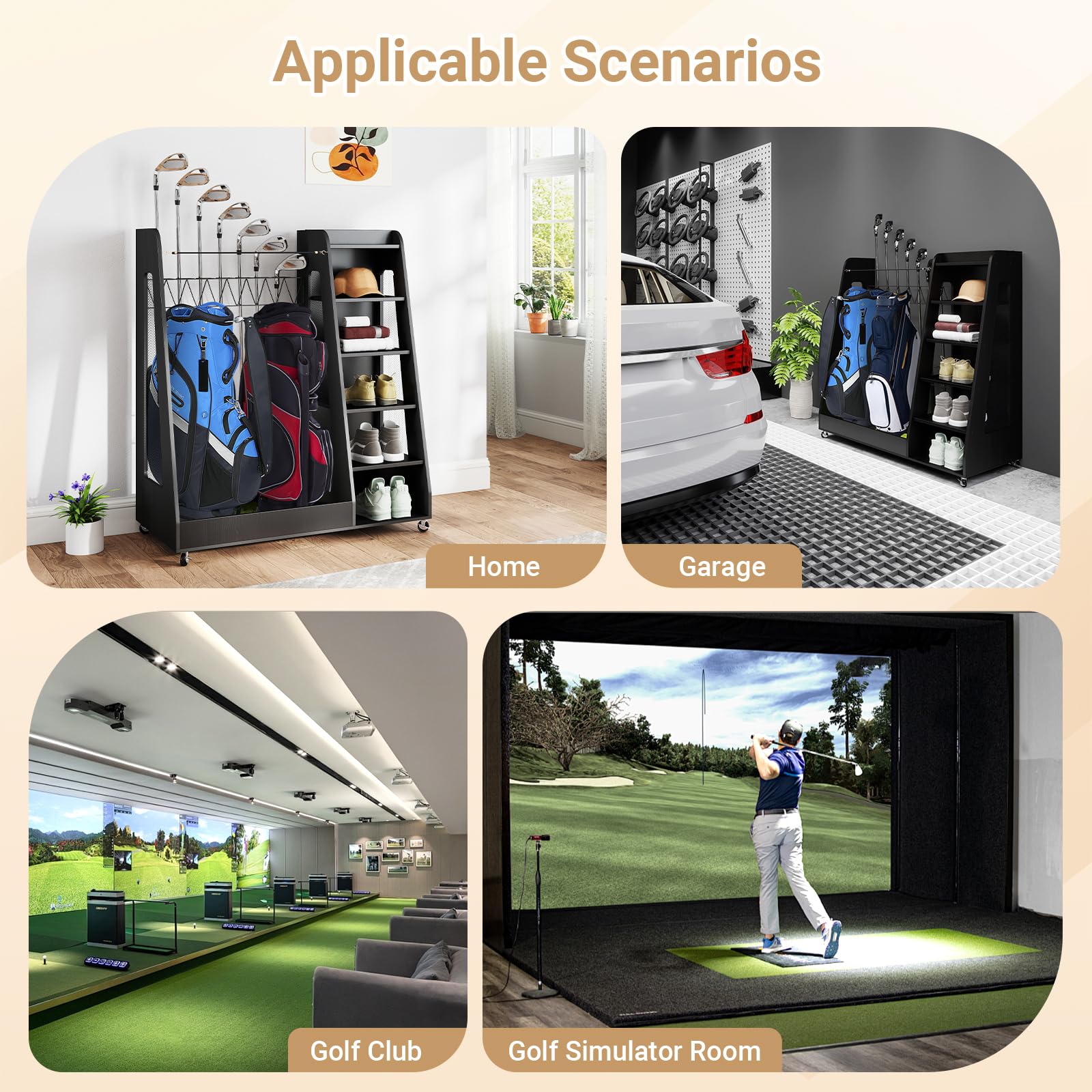 【Versatile for Multiple Scenarios】This golf organizer rack is ideal for a variety of spaces, including living rooms, garages, golf clubs, golf simulators, offices, basements, storage rooms, and backyards. Its versatile design blends seamlessly into both home and professional environments, offering convenient and organized storage for your golf equipment