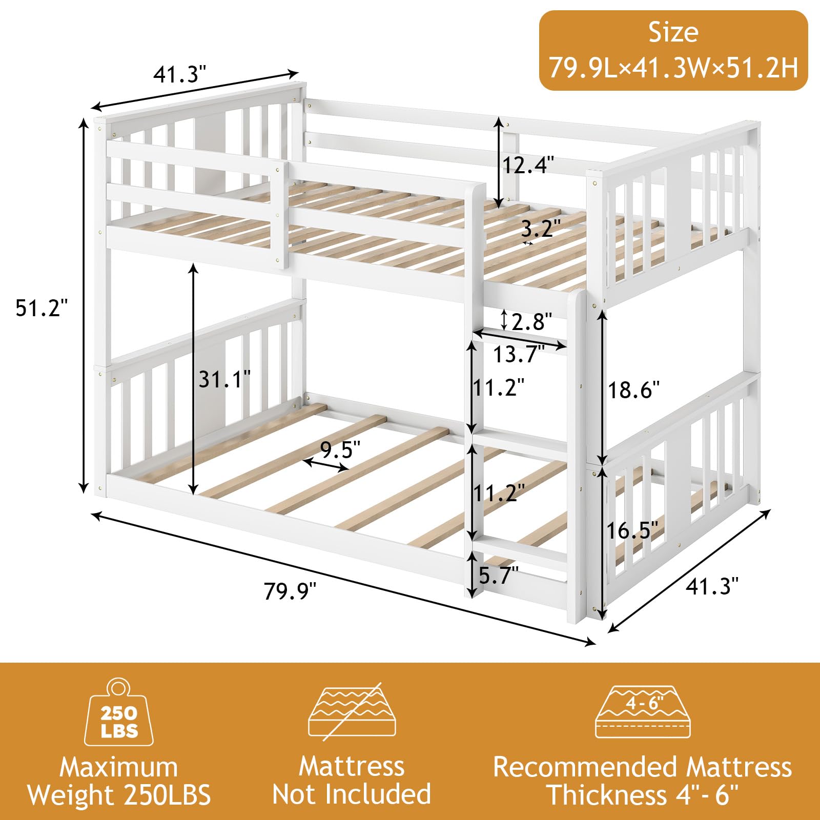 Wooden Low Bunk Bed Twin Over Twin, Solid Pine Bed Frame with Built-in Ladder, Convertible Bed Frame That Separates into 2 Twin Beds, Floor Bunk Bed for Small Spaces, Bedroom, White